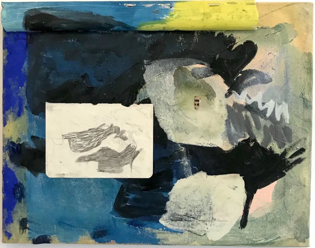 “无题(蓝色之境)”,2020 年,油画、蜡、干颜料、金属珐琅、拼贴画、蜡笔和木炭,亚麻布 11" x 14"
