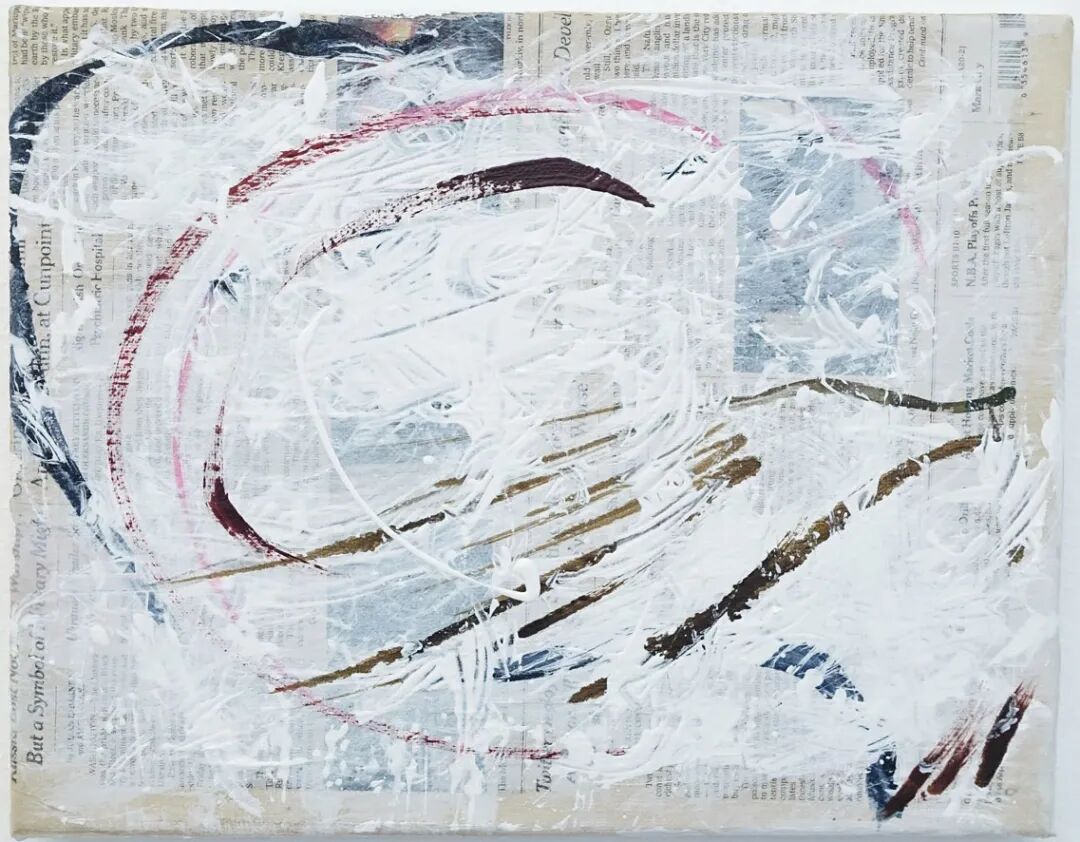 无题(马维斯之翼),2021 年,丙烯、水彩、拼贴、胶带和陶瓷,9”x11”