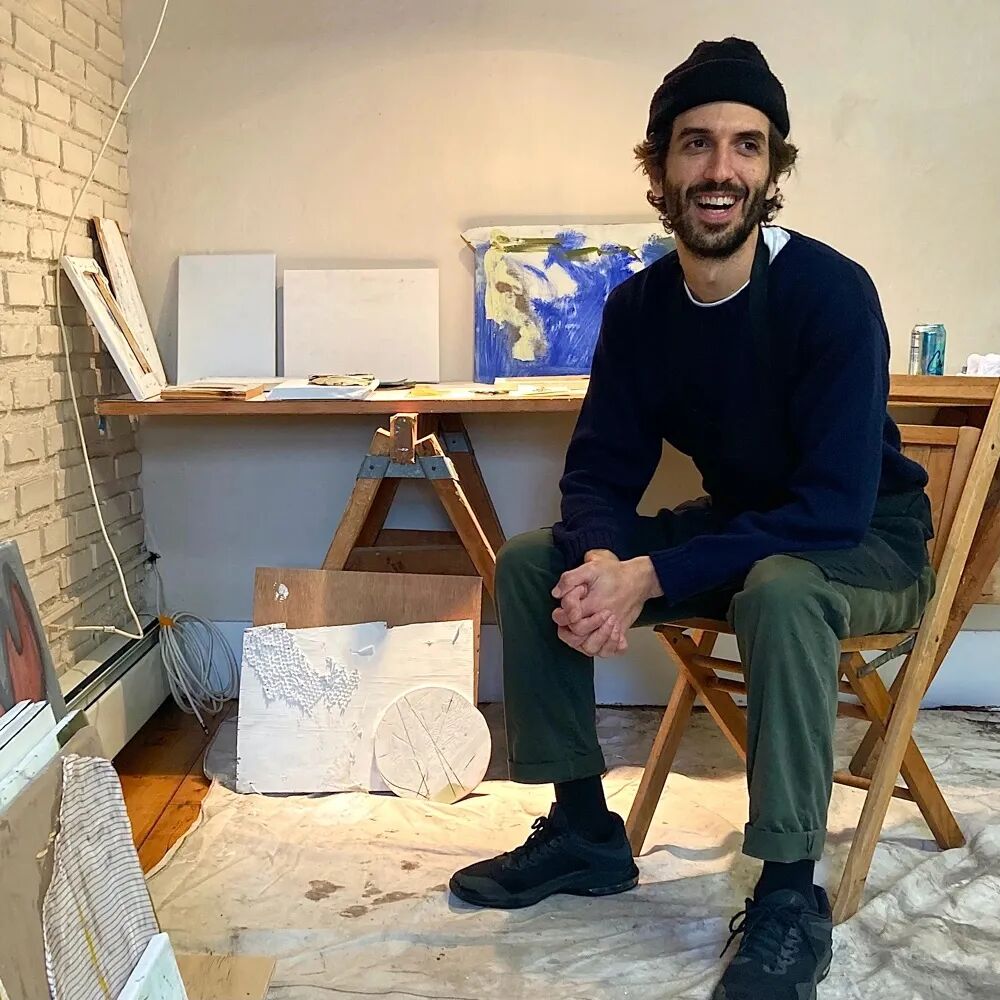 “比利时人”,2017-2020 亚麻布上丙烯、油画、木炭和蜡笔 21" x 25"