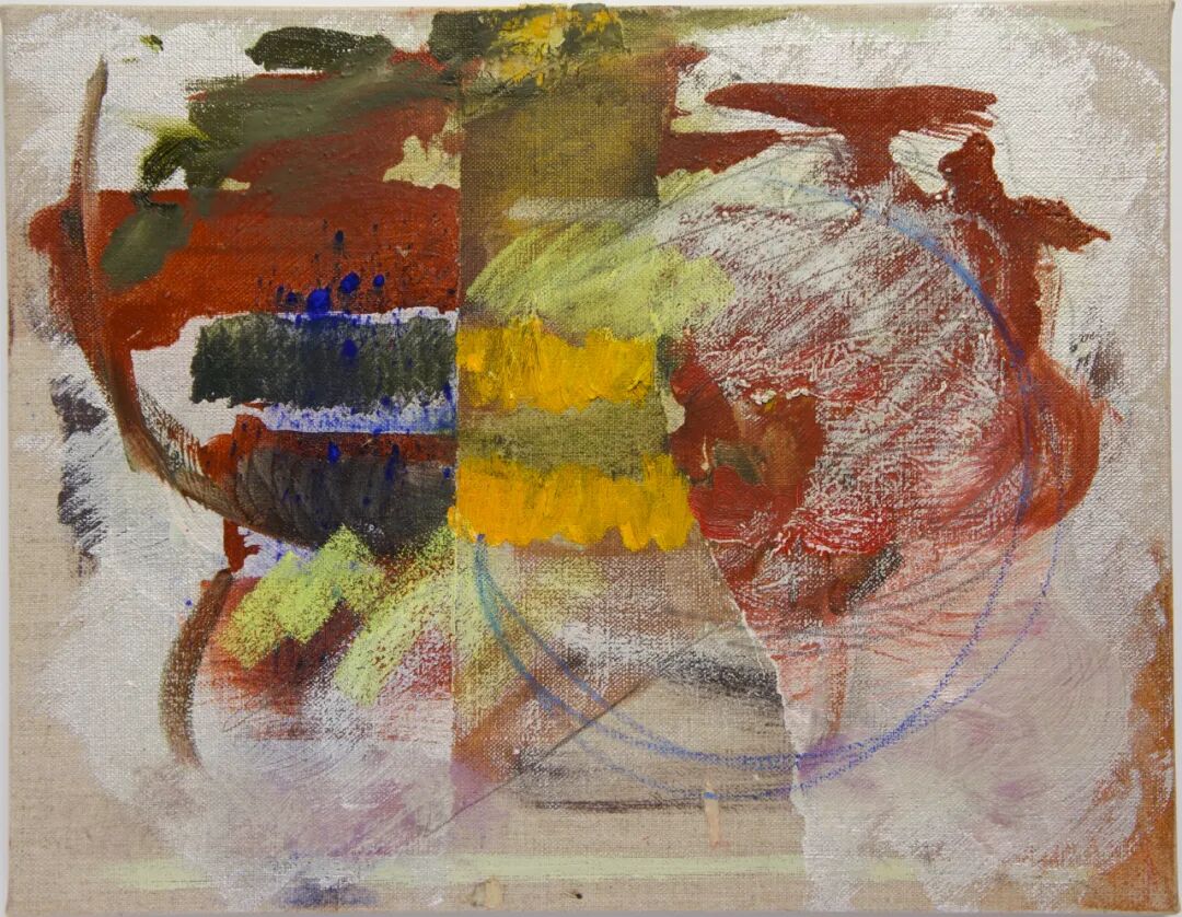 “无题(带 TO v.1)”,2021 年,布面油画、蜡、石膏、水彩和木炭 8" x 10"