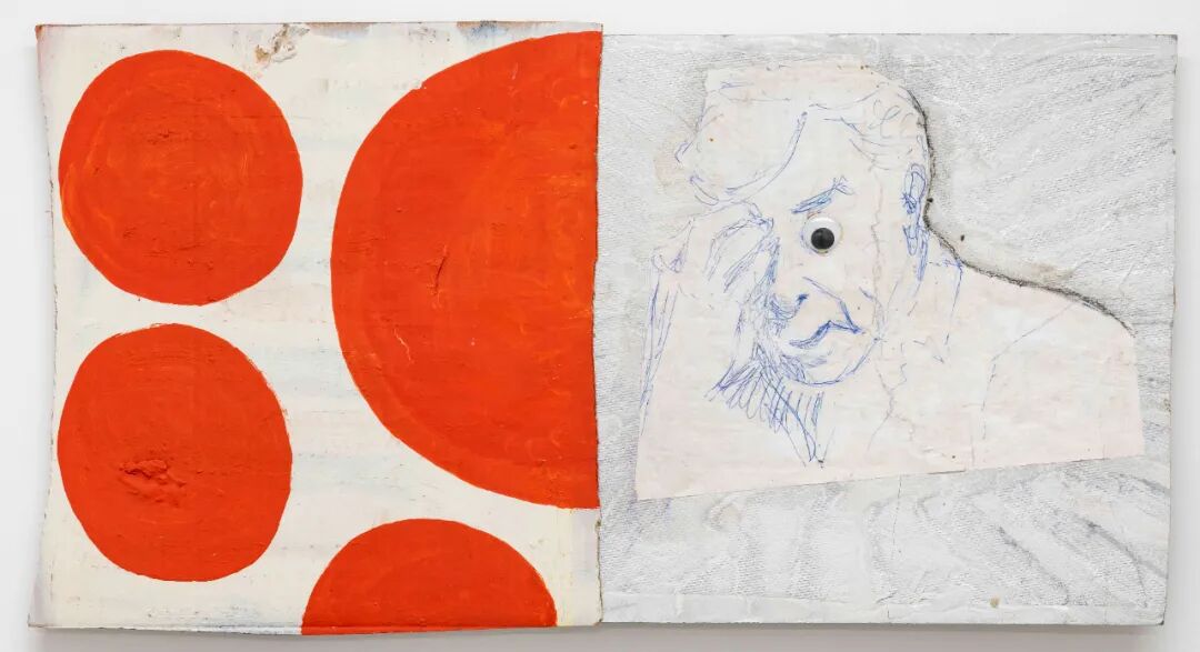 “无题(彼得·福尔克)”,2020 年,油画、丙烯、珐琅、拼贴画和塑料眼睛,装在画布上的纸板上,12 英寸 x 23 英寸