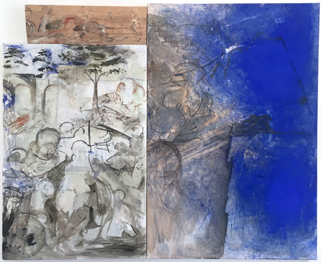 “蓝色和绿色的崇拜”,2019 年油画、蜡、木炭、干颜料和拼贴画布和面板 30" x 38"