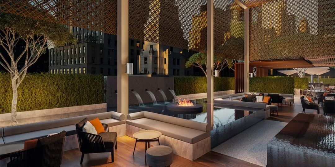 ▲ 较安缦东京在封闭的空中大堂里抽象描绘日式园林,安缦纽约14层大堂外的围合式露台显然实诚许多。四周围上灌木、JMG招牌的映射池贯穿露台各处,加之水中升起摇曳烛光和火焰,安缦“平和之境”的营造主旨被烘托得入木三分。而可伸缩的玻璃天幕可以让空中花园不受天气和季节制约享用。