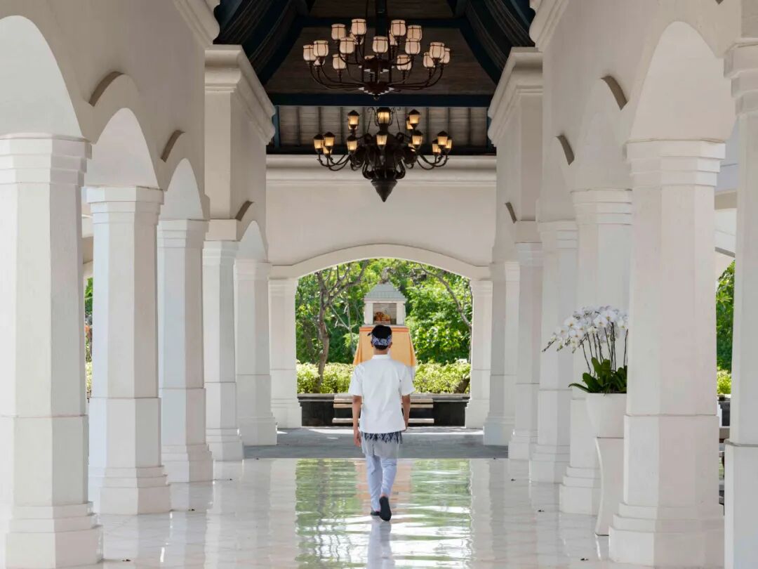 Martin Grounds以满者伯夷王国的黄金时代为主题,构想了整体的设计叙事。这个航海时代的王朝有自成一派的建筑特色,高墙围筑的城市蔚为壮观,内部有无数的亭台楼阁,有些专门用于沐浴,有些则用于社交休闲,皇家花园层层叠叠拾级而造,精美的水景点缀其间,倍添活力。卓美亚巴厘岛酒店再现了这些传统空间构造,构筑起一个奢华无比的水之宫殿,欢庆生命无上的华美乐章。