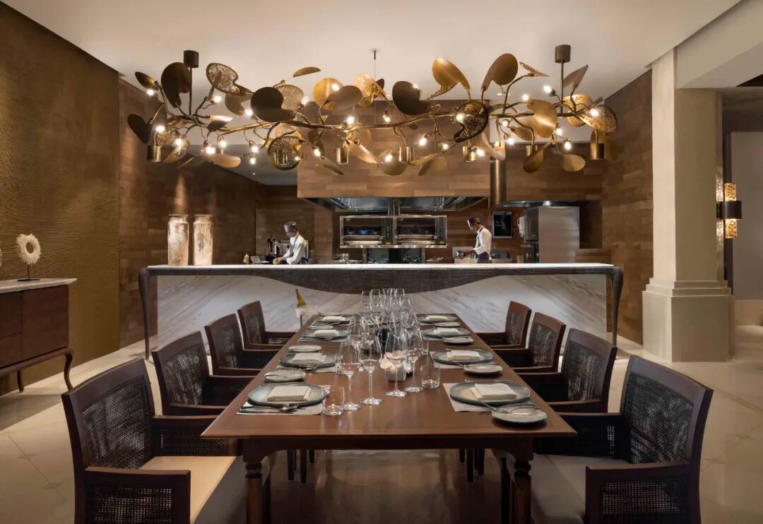 Arva 的地中海风格餐厅,位于可俯瞰中央公园的环绕式花园露台上。设计师以现代语义抽象树形灯饰,诠释了安缦标志性的简约主义和自然主义审美。