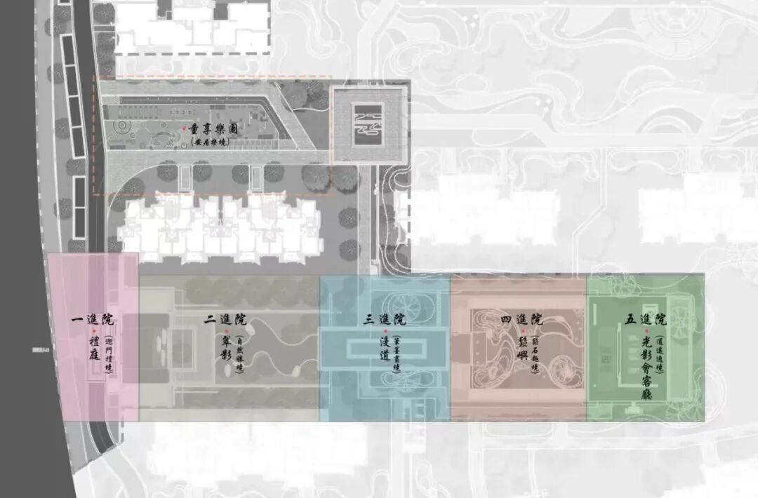 项目西侧园内景观空间以书院文化作为设计基底,整体布局传承于碧江书院,由礼庭、翠影、漫道、松屿、光影五部分组成,通过不同院落的空间转折、拆解视线焦点,营造出层层递进的五进院落空间。每一进空间对应一个意境,五境入画,一卷知书,以自然生境的巧借,人文精工画境的雕琢,带出情景交融下的意境升华,形成诗意流淌的空间回忆。
