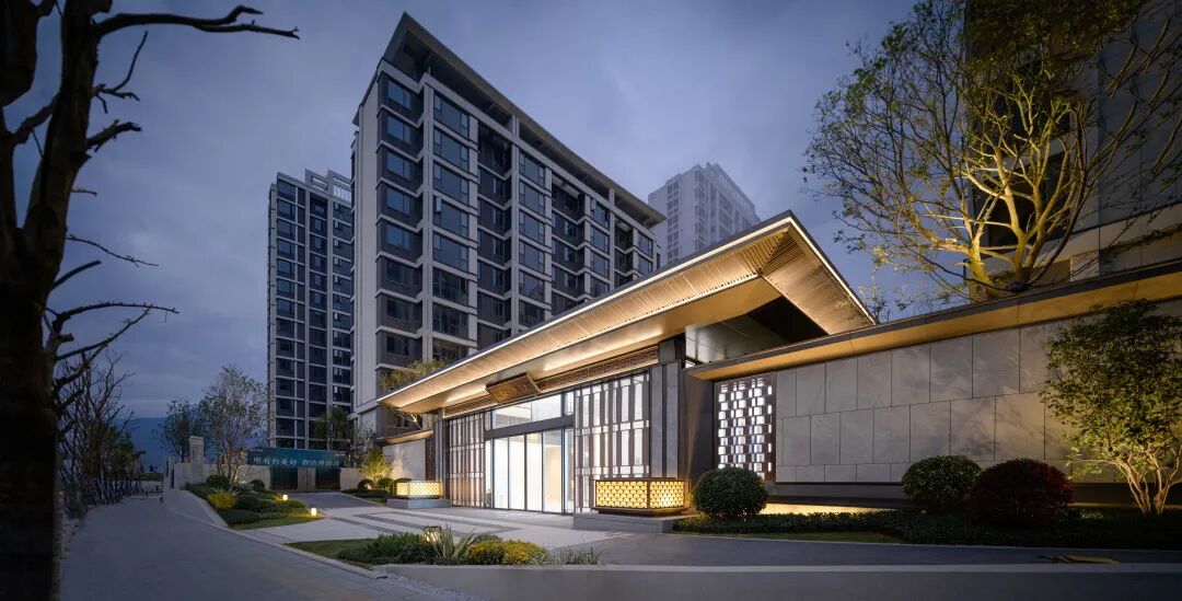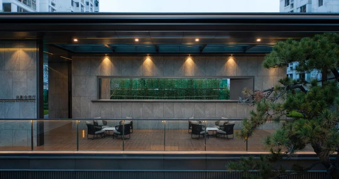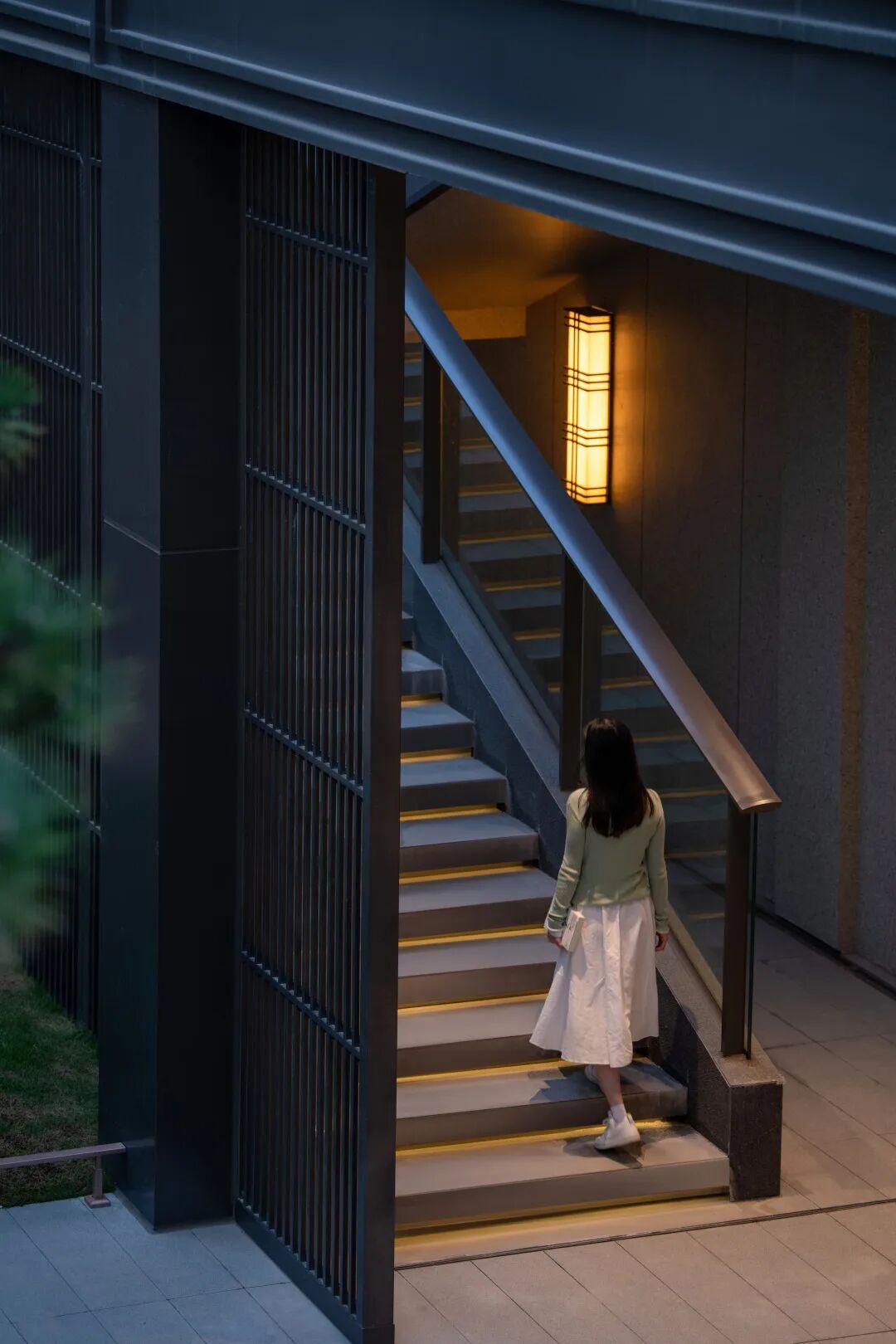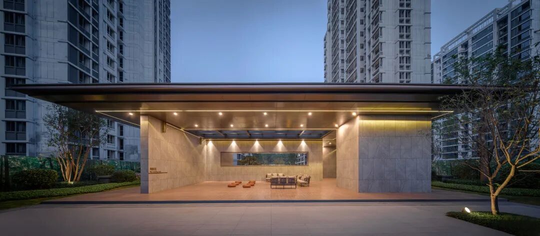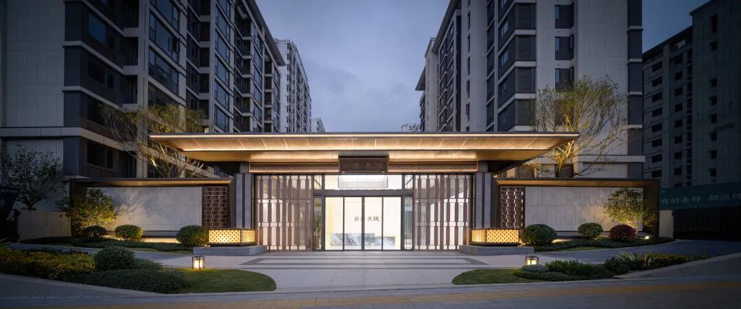 一进以礼遇的“归家”仪式呈现,源自中国人的归家“礼”制和对“家”的珍视。门楼长约36m(含两侧景墙)高约6.6m。以传统书院院门构造为基调,中轴对称屹立、入口进门采用三间一启的府门形式,两侧的宫灯对列相迎;设计风格去繁从简,结合并演变古典园林设计手法。在细节上提炼书院专属元素。如精致造型格栅,虚实结合,平衡门楼厚重感;门头横梁上回纹连绵不断,宫灯精致扇形图案,均暗含美好祝愿。