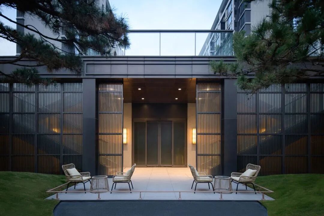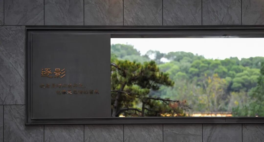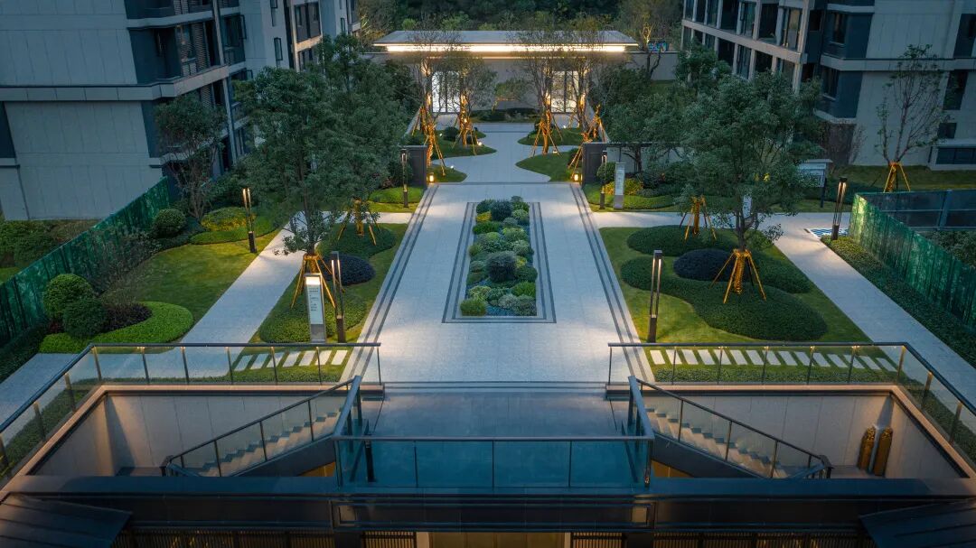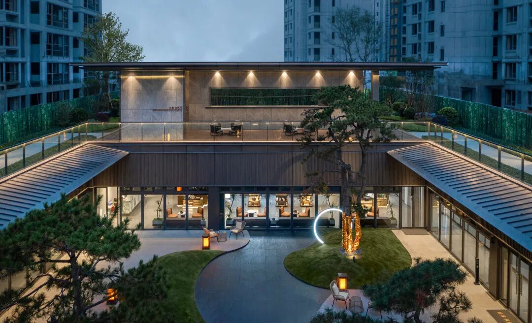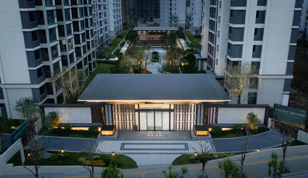 一进以礼遇的“归家”仪式呈现,源自中国人的归家“礼”制和对“家”的珍视。门楼长约36m(含两侧景墙)高约6.6m。以传统书院院门构造为基调,中轴对称屹立、入口进门采用三间一启的府门形式,两侧的宫灯对列相迎;设计风格去繁从简,结合并演变古典园林设计手法。在细节上提炼书院专属元素。如精致造型格栅,虚实结合,平衡门楼厚重感;门头横梁上回纹连绵不断,宫灯精致扇形图案,均暗含美好祝愿。