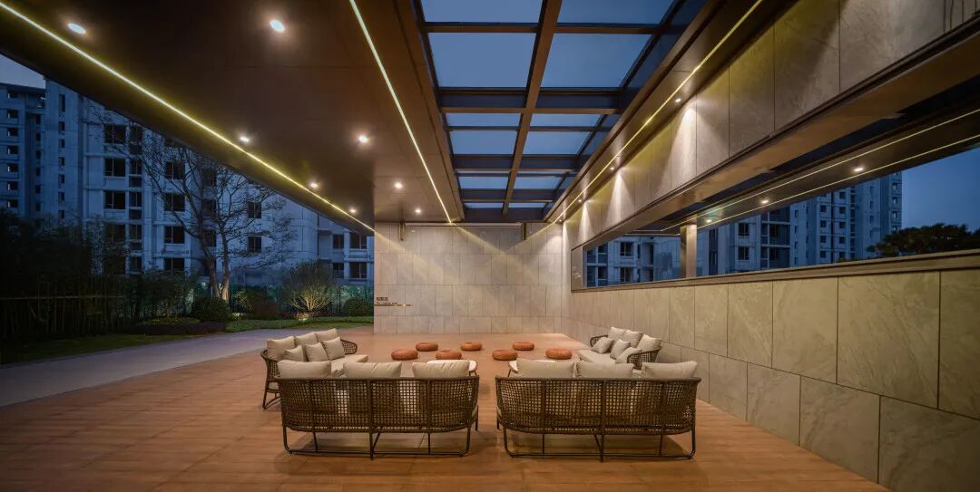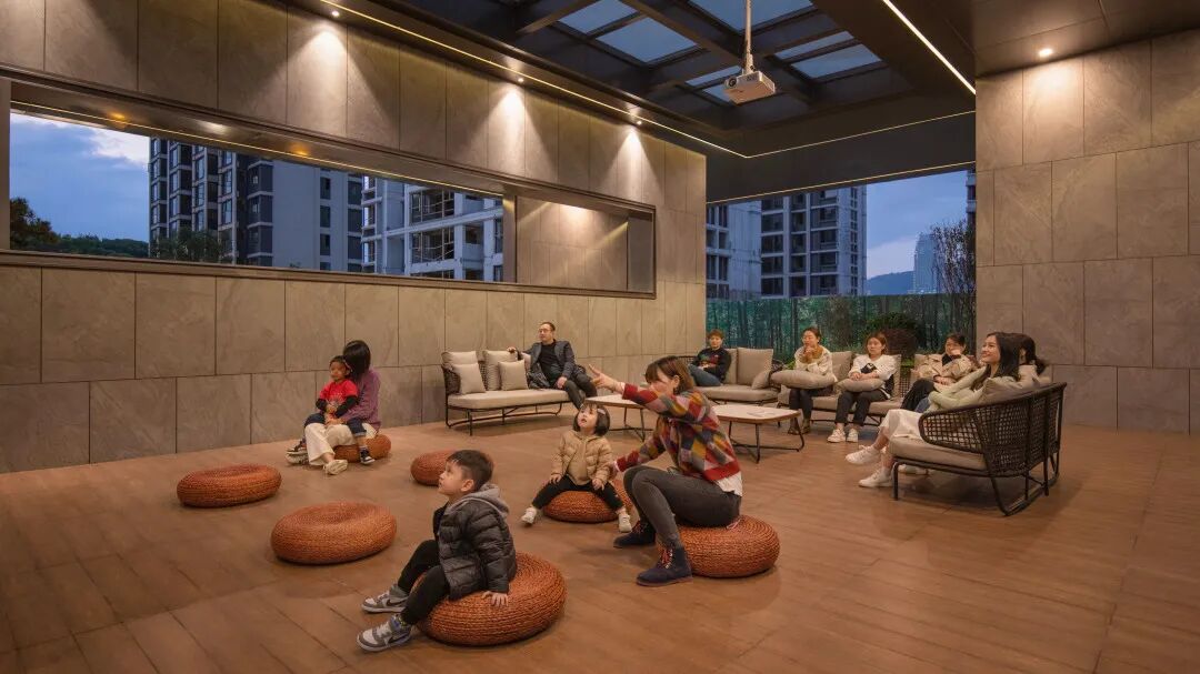 “光影会客厅”,打造公共交流空间。墙体引用中式书院的框景手法,虚实结合,通过视线的穿透转移,框定出另一幅画面。通过开敞的空间营造和社区生活组织,引导人们走向园区,激发更多人群之间的交往互动,实现从家到公共空间的自然过渡,重塑社区邻里关系和生活归属感。
