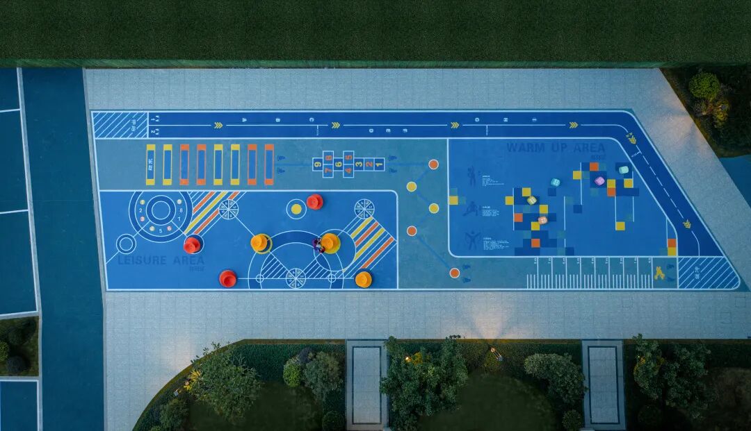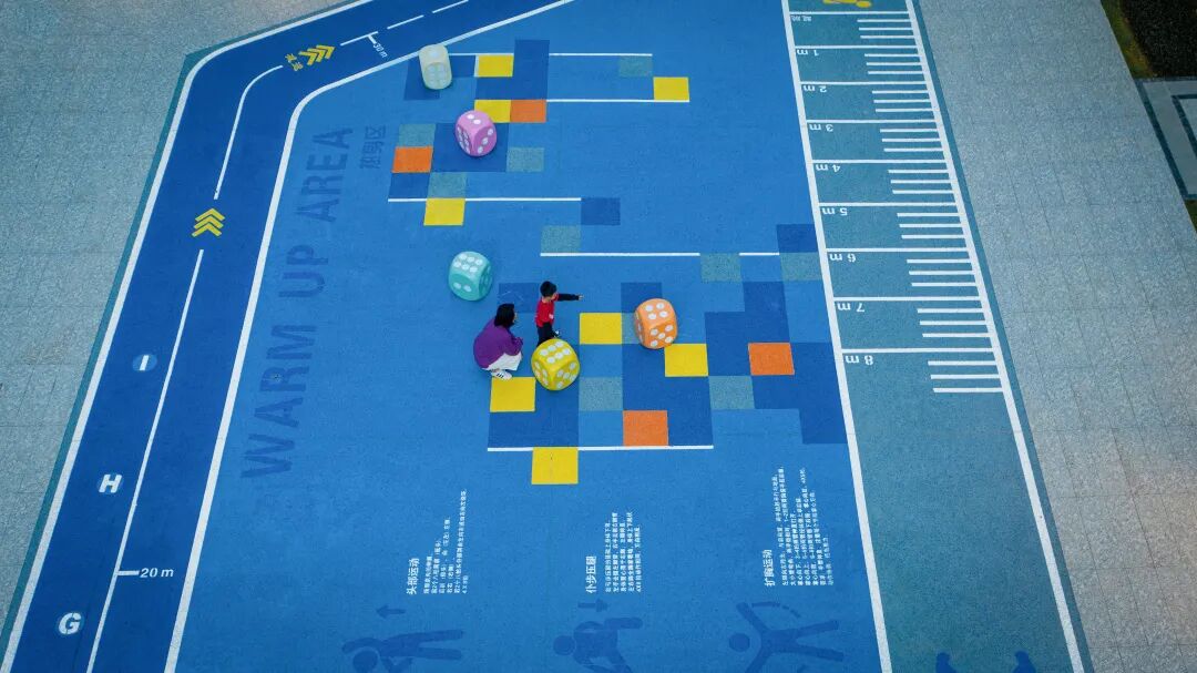 跳方格、骰子、跑道、跳远、转转椅等运动设施,在功能上充分考虑“运动共享”的乐趣,提供自我锻炼的空间,场地周边配备休闲树池座椅,为家长看管孩童时交流谈心提供方便。