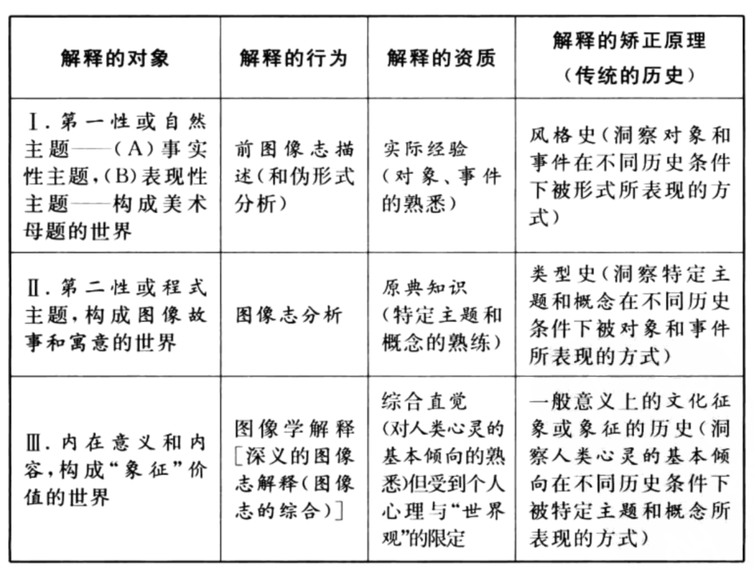 潘诺夫斯基的图像学的方法和框架是为了更好的阐释与衍生,给予个体在文化语境中如何建立自身知识结构的范例而非给予具体的答案,对美术史的学习需要利用好方法,建立好自身知识的结构,延伸出具有价值的坚实结论。