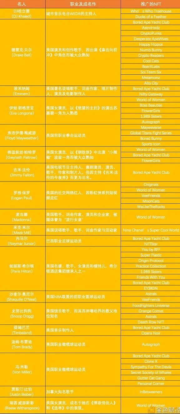 / 下滑查看:19 位被TINA点名的名人推广的NFT及相关信息一览表 / 图源:金色财经