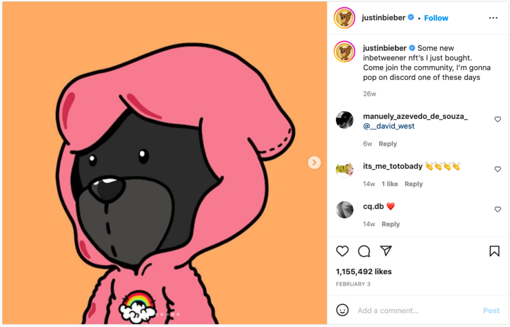 / 上:曾被贾斯汀·比伯大力“带货”的NFT项目InBetweeners / 图源:截图转自TINA