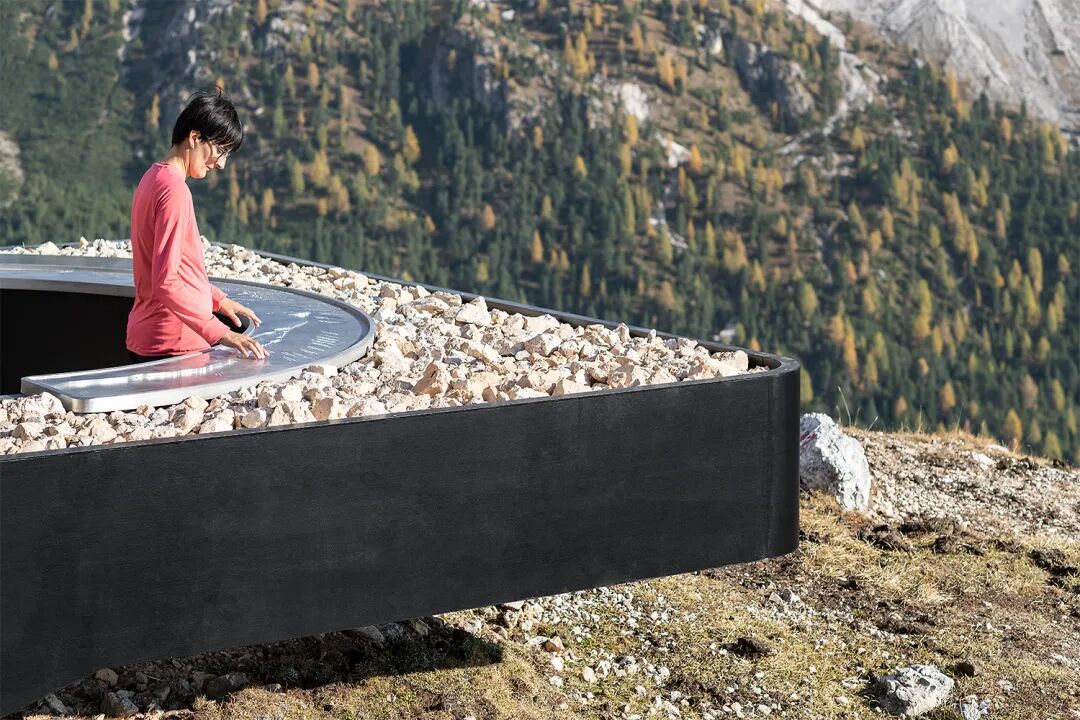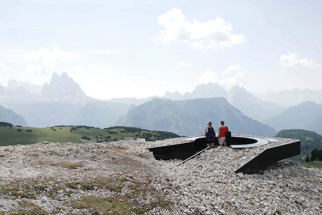 这座瞭望台隐藏在多洛米蒂山脉中,设计团队没有建立单独的结构,而是决定提升部分景观。深色钢结构充当场地材料的容器,看起来像高架表面投下的阴影。通过这种方式让瞭望台与场地紧密相连,同时又避免了对风景的干扰。