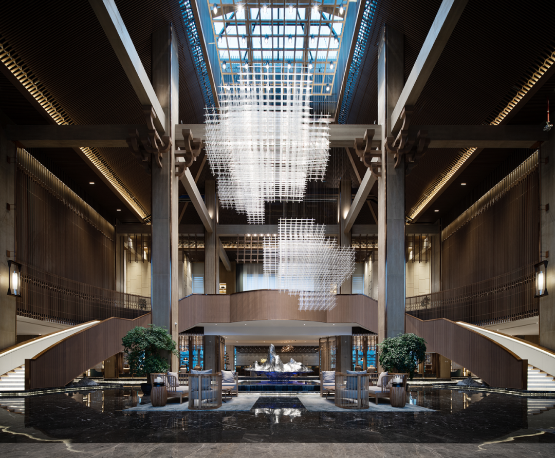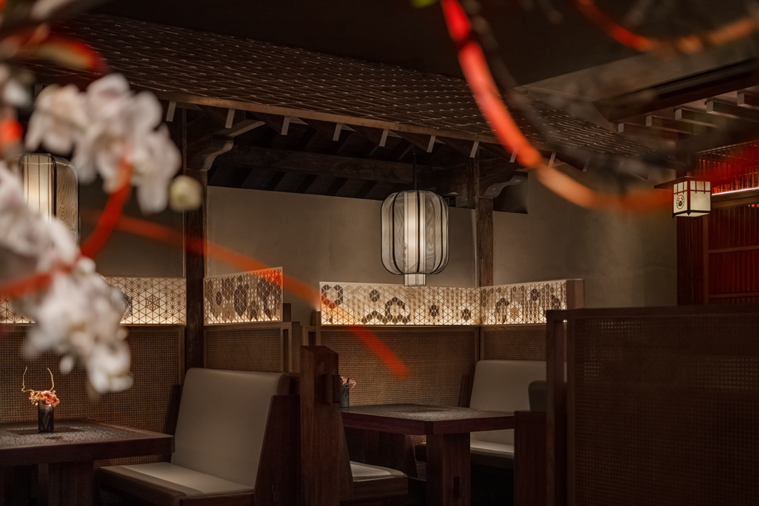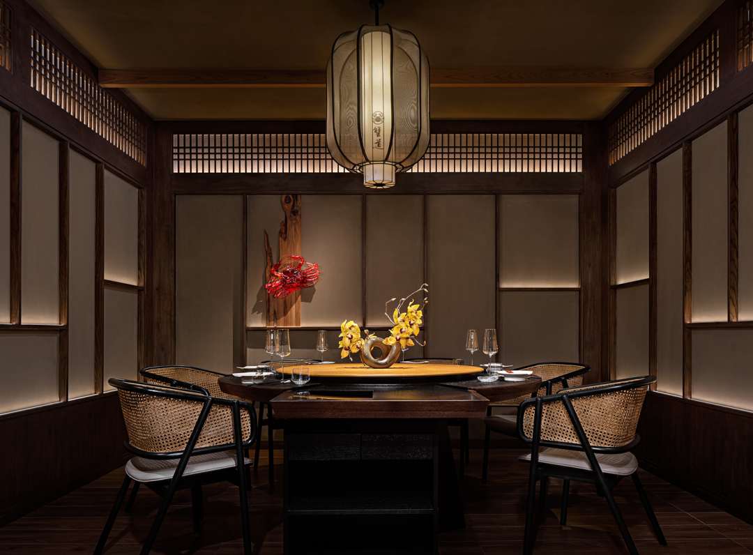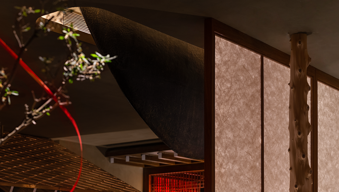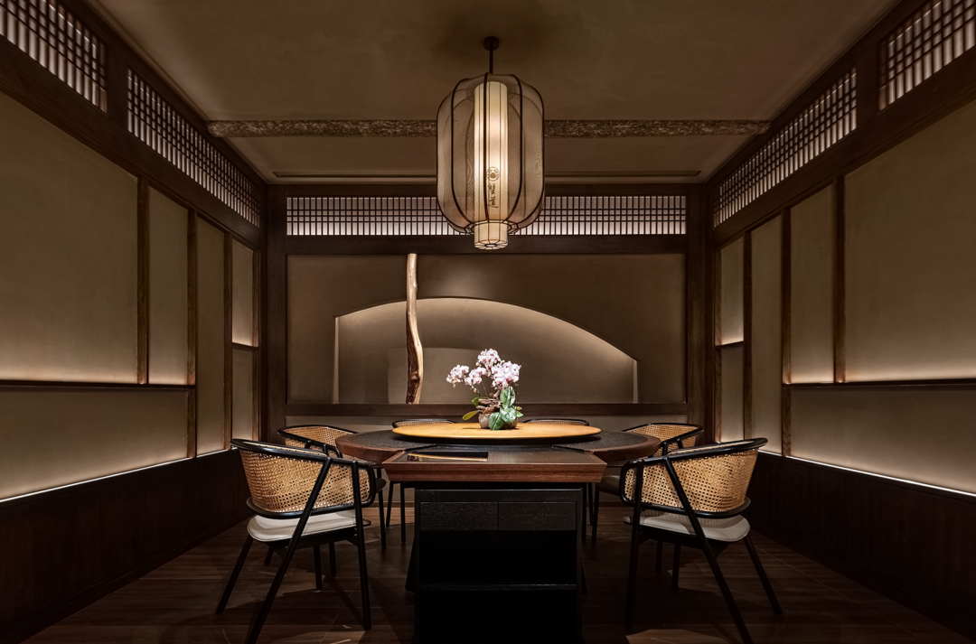 In traditional Japanese architecture, there is a very special wooden corridor outside the house and under the eaves, which is usually the junction where sunlight enters the room. In the design, this interesting feature was placed in the verandah of the private compartment area. The combination of traditional and exquisite bamboo weaving form and modern lighting technology simulates the relationship between light and houses in traditional buildings, and at the same time satisfies the blurring of the boundaries between interior and exterior space design. Whenever you enter and exit the private room, you can experience the diversified changes of the spatial level.