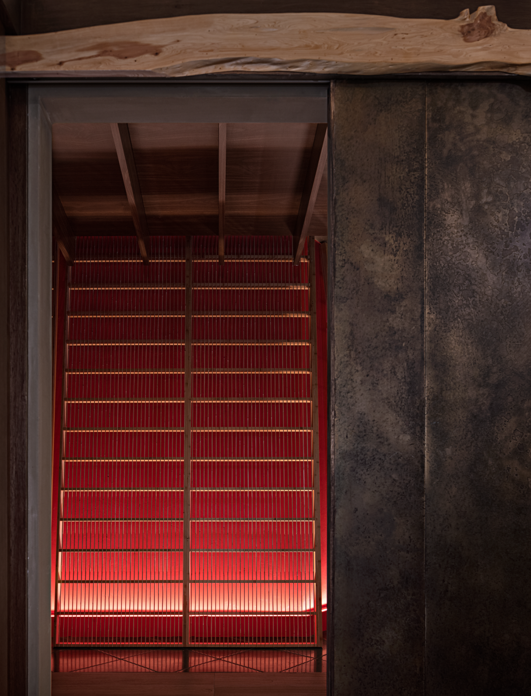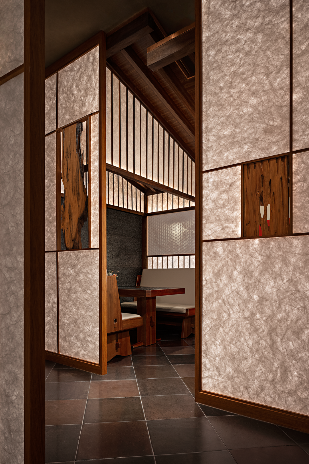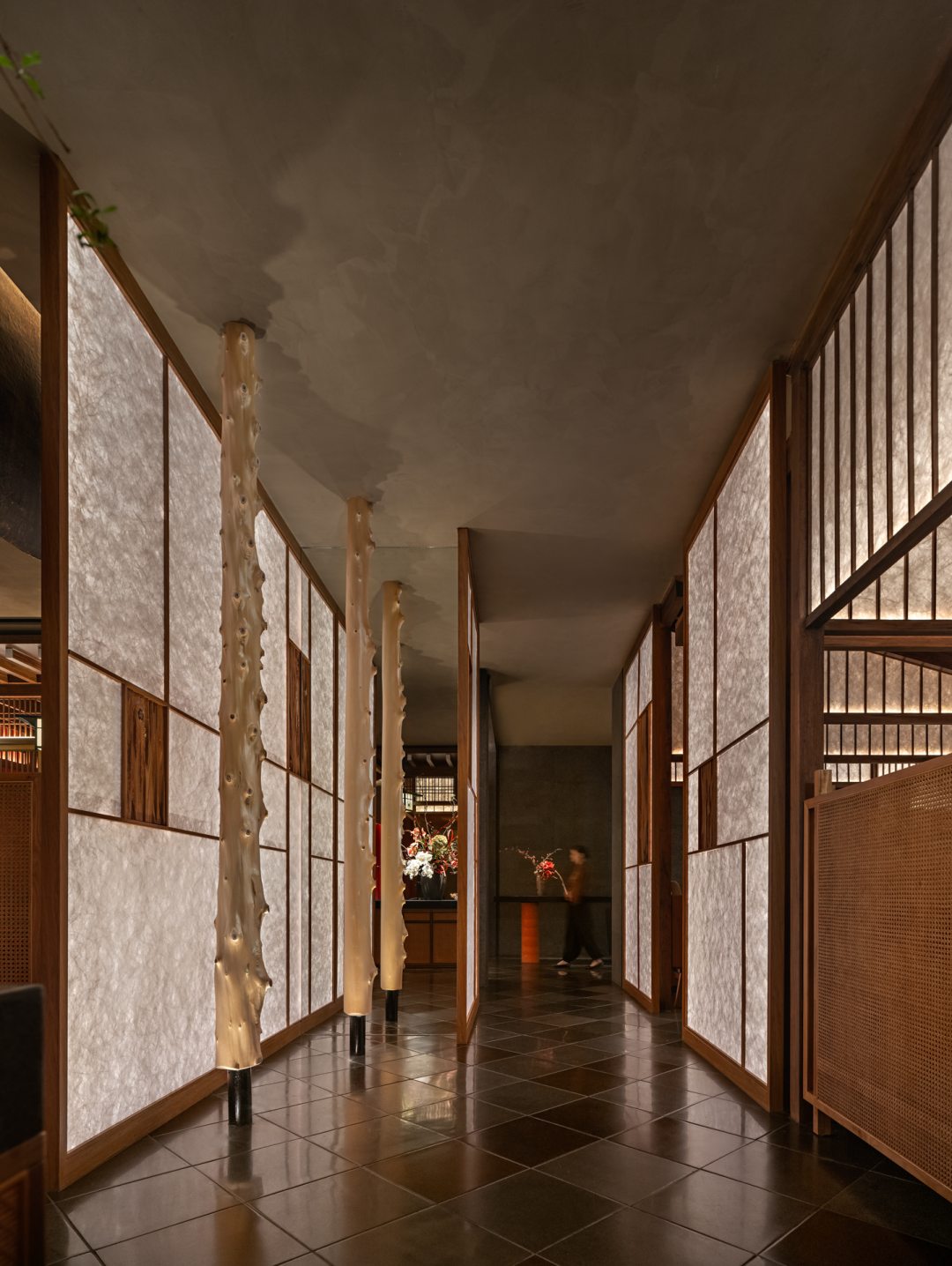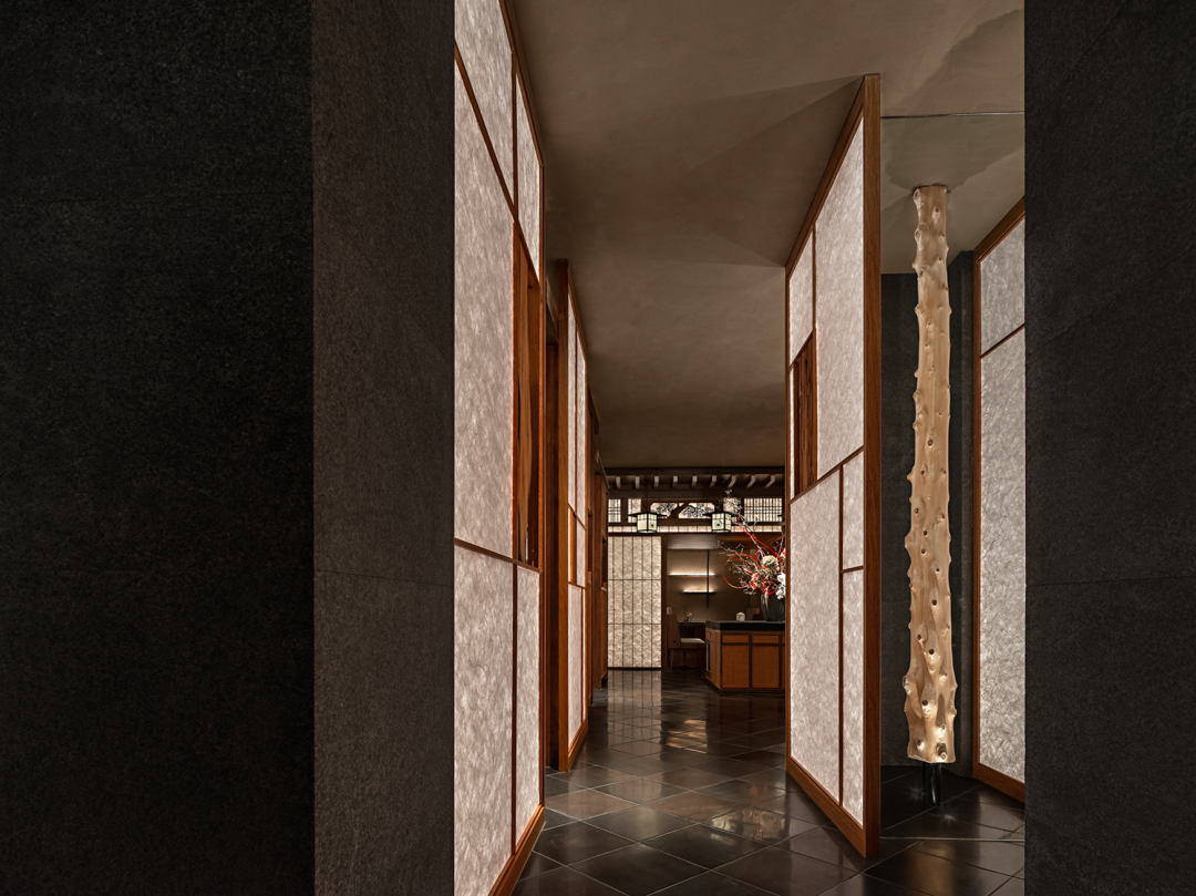在阴翳美学中,光线对室内产生影响的元素——障子。设计师尝试在障子的传统边框中植入现代微小的线性灯光,使障子不受传统尺寸的宽度、高度所束缚而均匀透光。在选择障子敷面纸张时,刻意避开了传统纸张的刻板印象,而是采用现代工艺技术的纤维纸来做敷面。透过灯光,纸张内的纤维呈现出一种絮状花纹般的温暖效果。通过连续排列几扇开合的发光障子,视线与动线便合并成向内的通道。