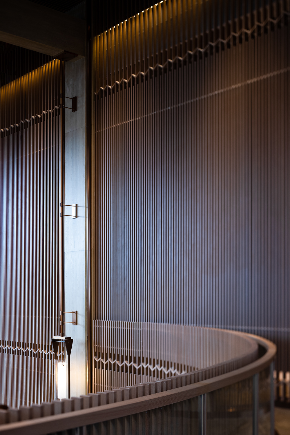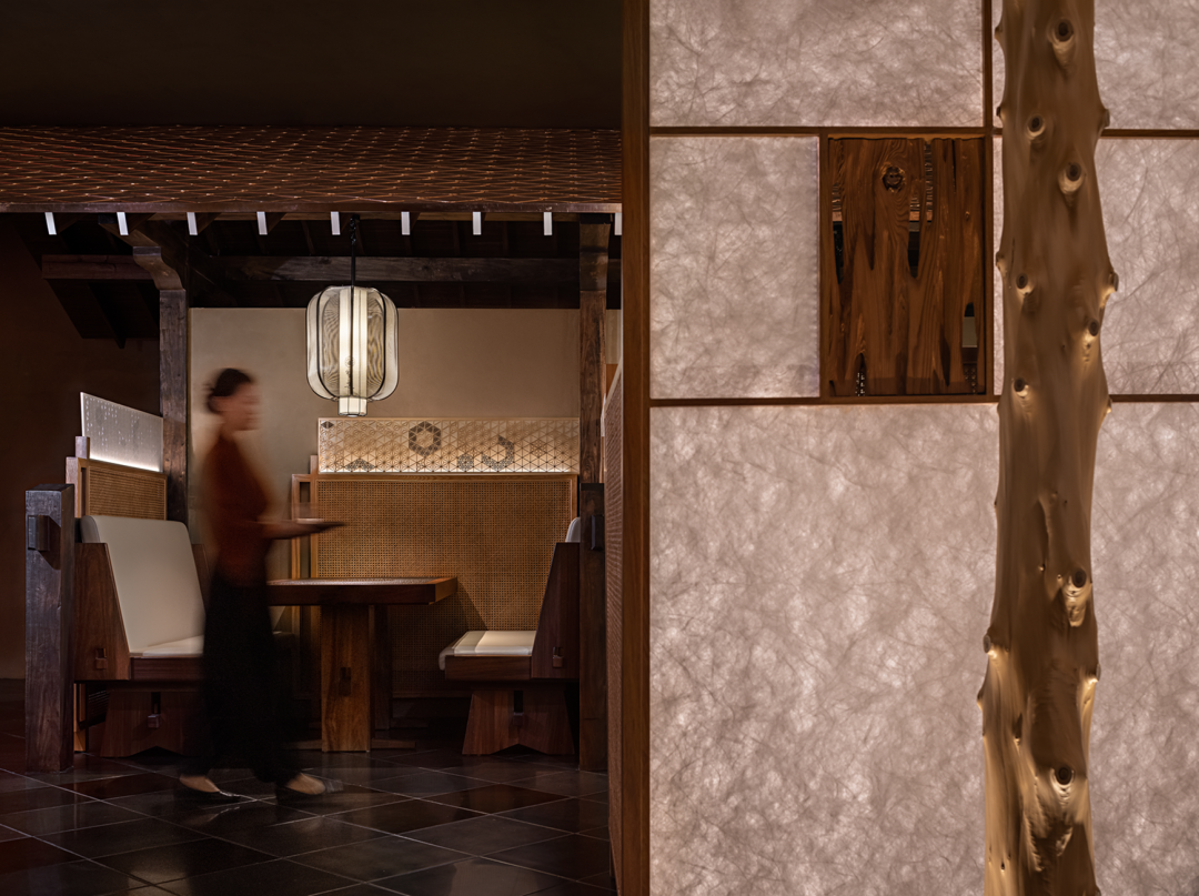 在传统日式建筑中,房屋外与屋檐下有一条很特别的木质走廊——縁侧 ,通常也是阳光洒入室内的交界。在设计时,将这个有趣的特征安置在私密包间区的外廊处。并借用传统精巧的竹编形式与现代灯光技术相结合,模拟出传统建筑中光与房屋之间的关联性,同时满足内与外空间设计上的界限模糊化。每当进出包间时,都能够体验到空间层次的多样性变化。