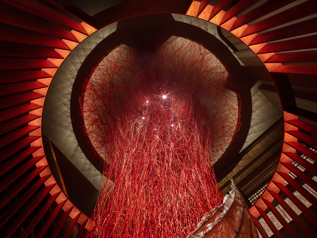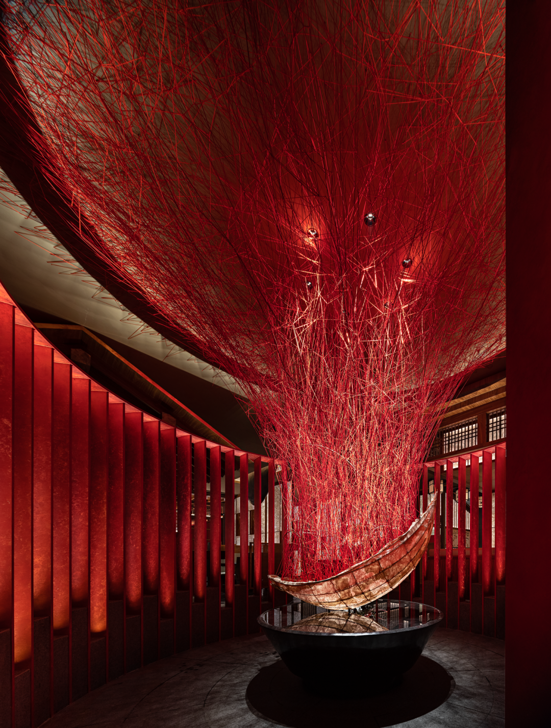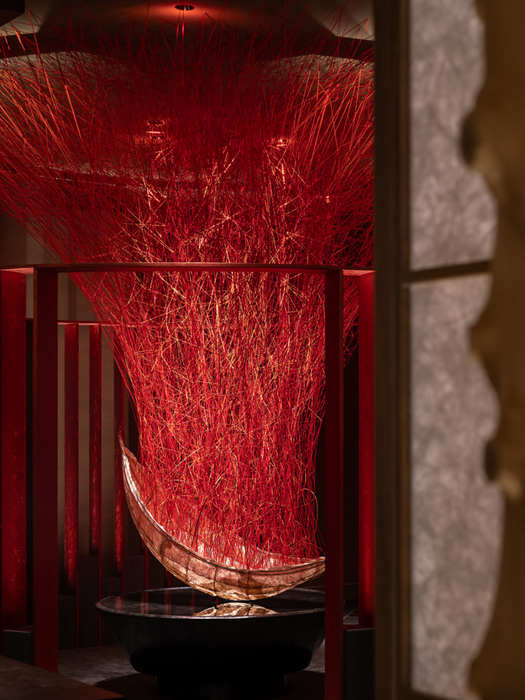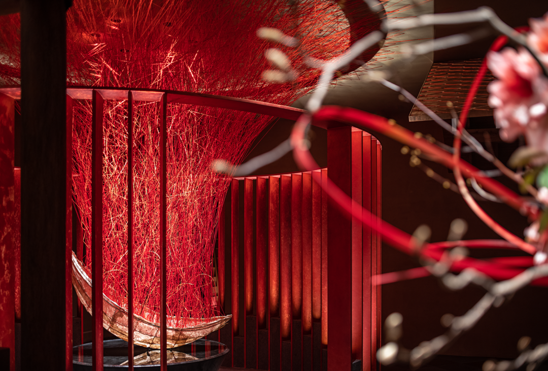 借鉴相同的灵感表达方式,将思绪、灵感亦或是抽象无形的精神状态,转变成一种可见不可言的情感语言。身处红色圆环空间的包围下,我们缓步感受着若隐若显的情绪起伏,达到空间与人的情感互动。