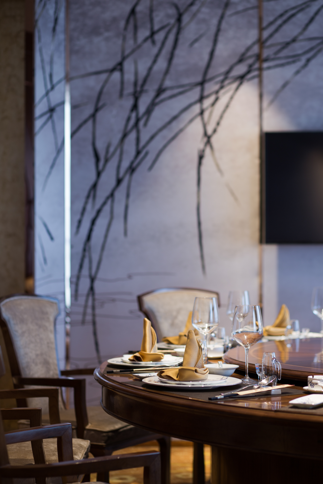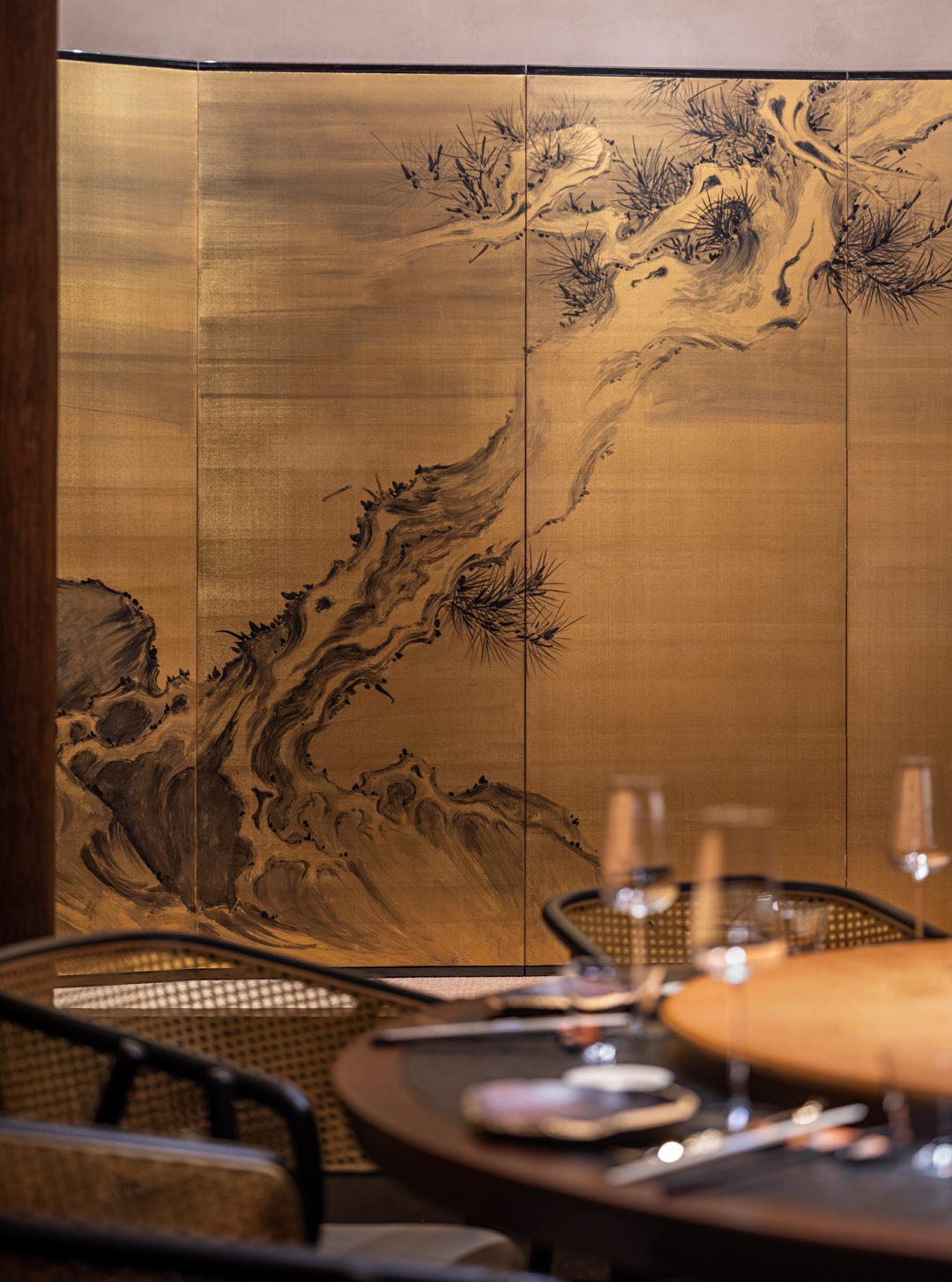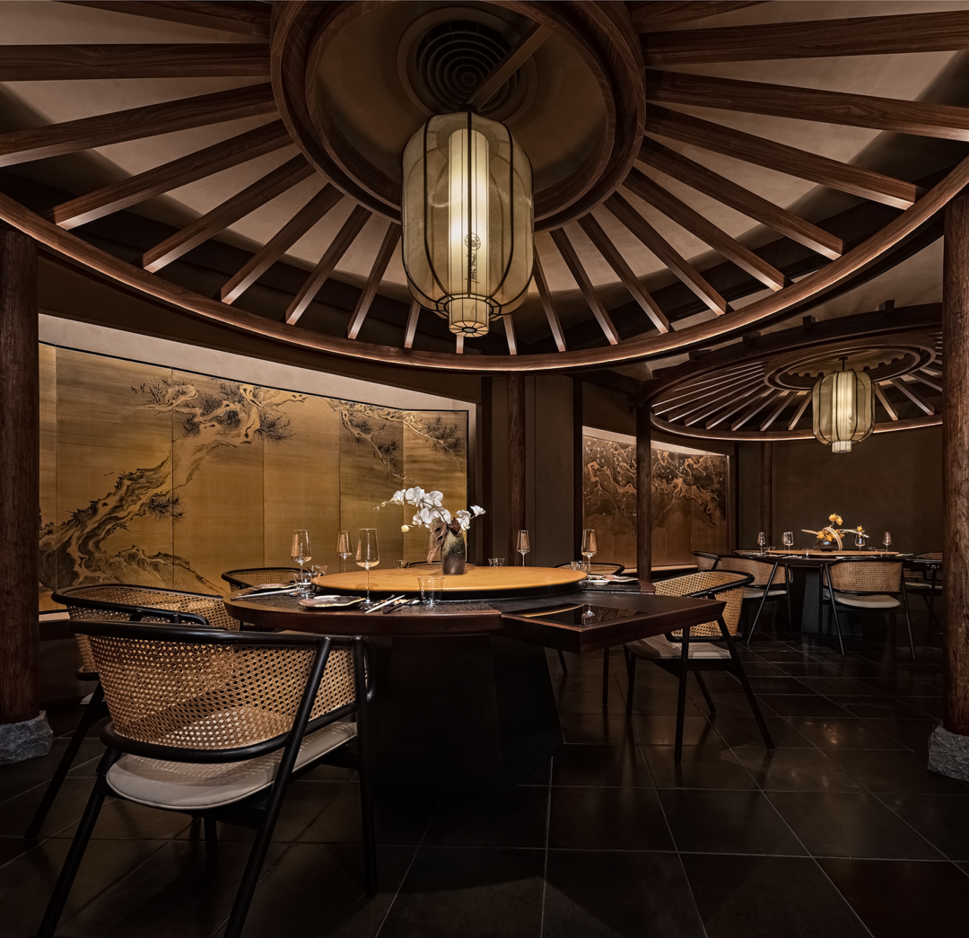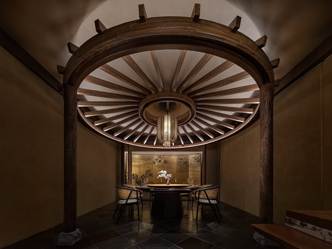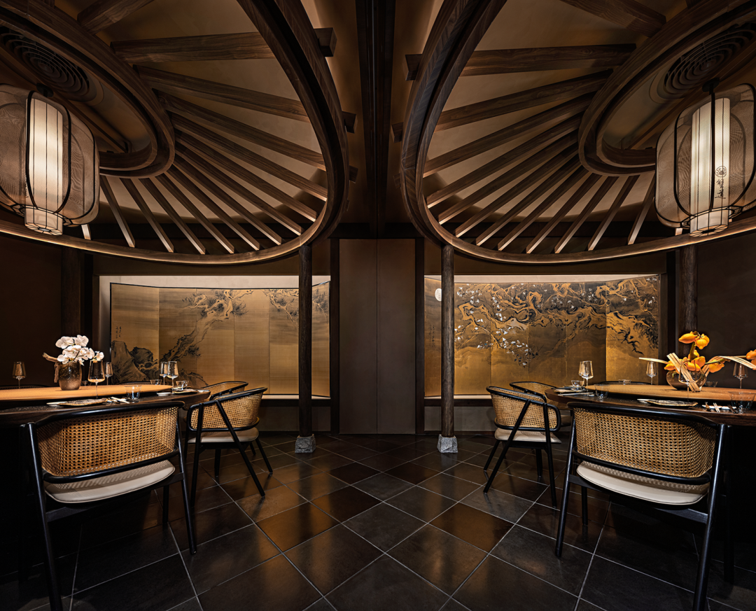 基于这种因结构形式而生成的象征性,在包间设计上仿照和伞,将伞的结构形式固定在空间中形成亭。伞亭的设计带有一份可以遮风挡雨般的安定与舒适,也是将差异化的就餐体验融入其中。设计师还为包间定制了精美的艺术家画屏《银叶盛月华》,春夏秋冬、四季轮转、四时赏味、起承转合,意义在于把一件事做得完美和极致,独特的韵味与魅力,言之有物、拙朴天成,细微之处见风雅。