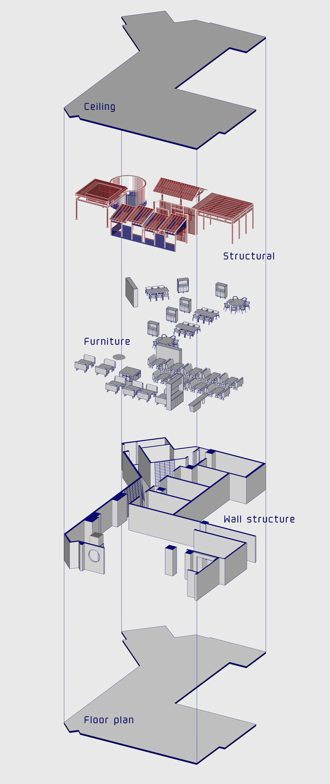 餐厅的核心就餐区,在空间布局层面上,设计师考虑了几种内外交错的空间形式融入其中:有刻意压低屋顶而无墙体或不完全封闭的亭;有拾级而上视线高差变化的堂;还有联排相座的小比例舟屋;或是坡屋檐下半围合形成的檐廊。采取多种建造形式将餐厅核心区围合成内院式的公共中庭。