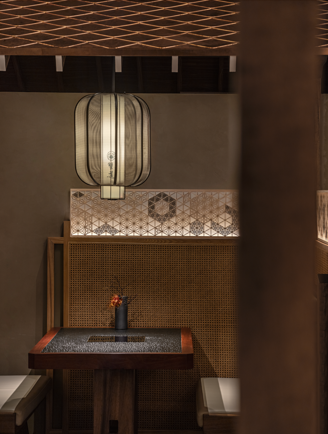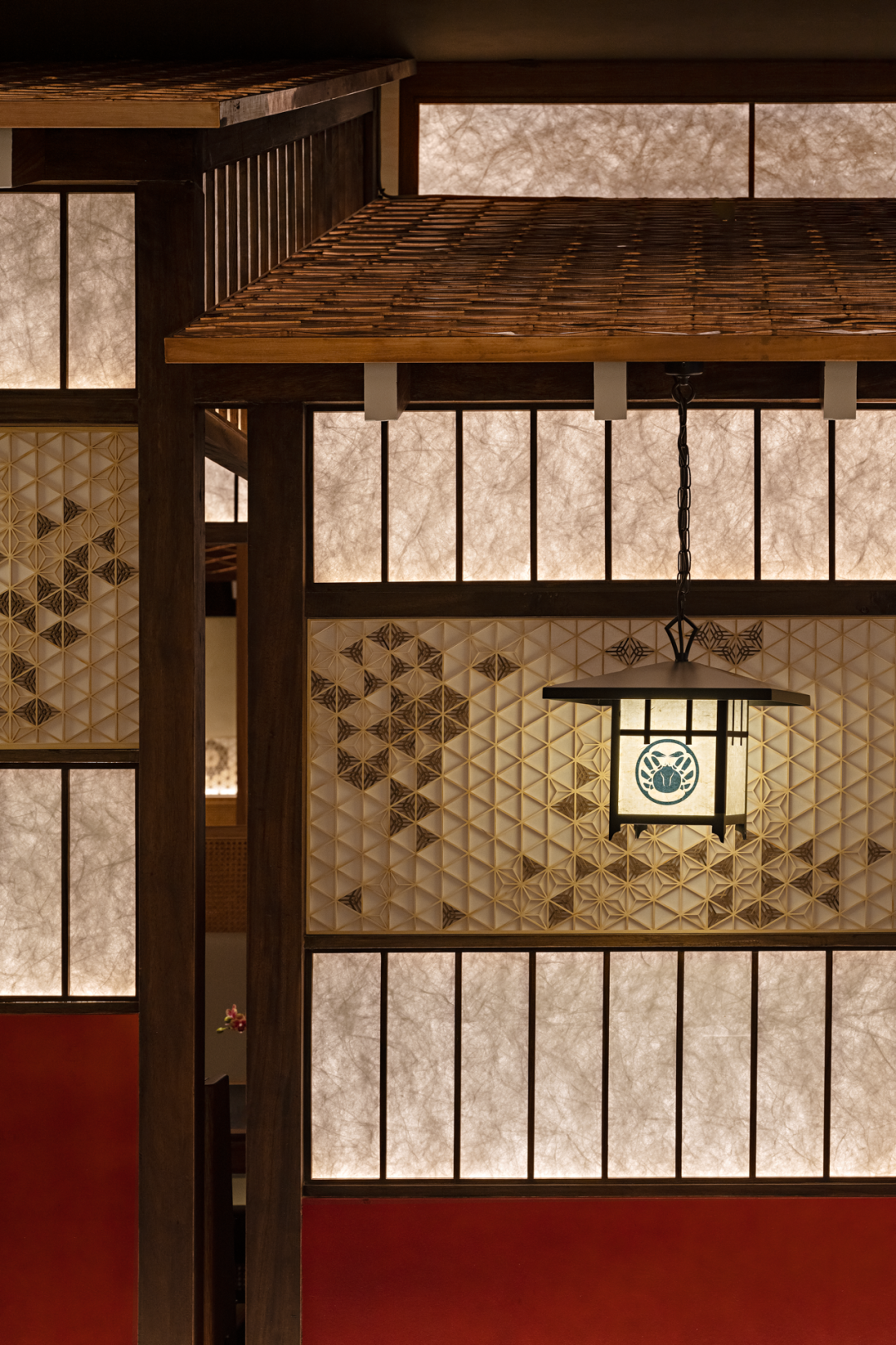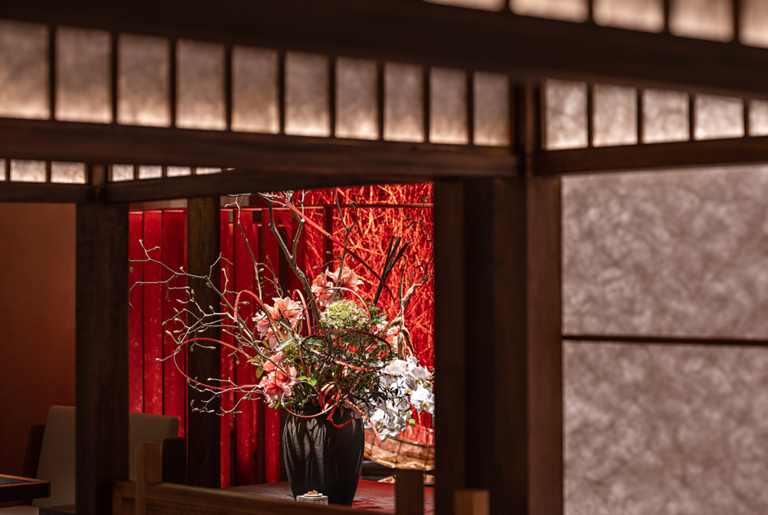 在花窗与隔间的细节处,选用最能代表日本木工细节技艺的(组子)细工排列其中,它几乎是用一种悄无声息的方式在绽放着精致工艺。