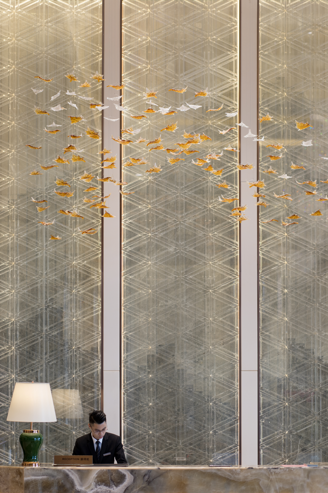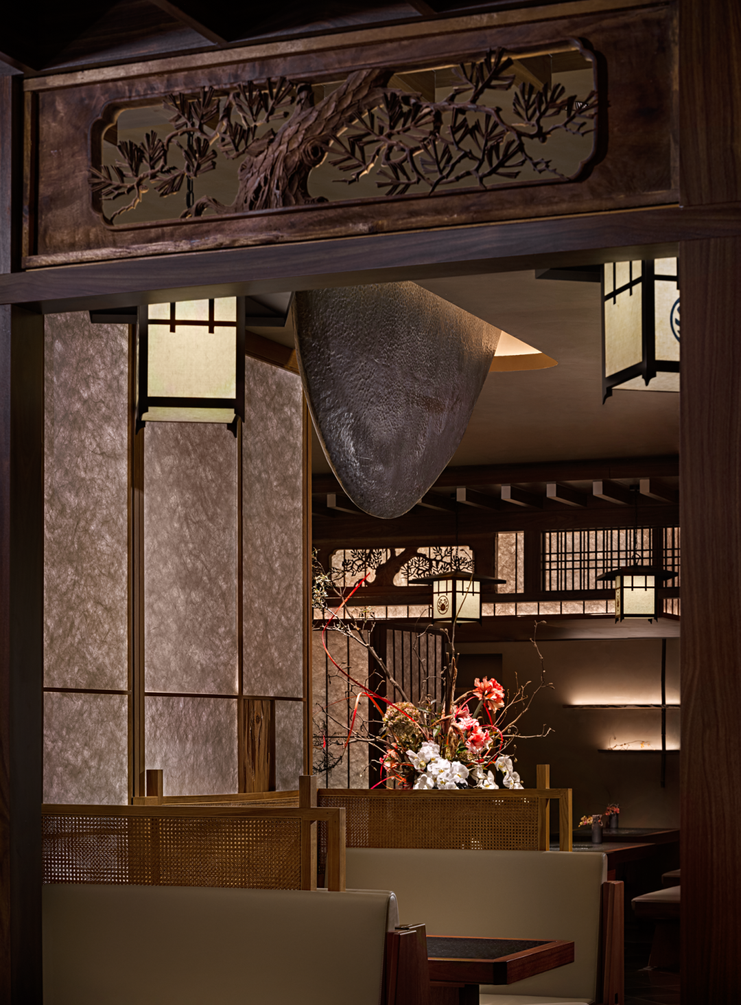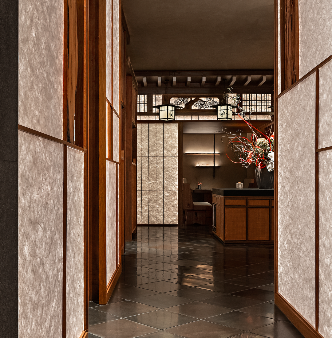 在花窗与隔间的细节处,选用最能代表日本木工细节技艺的(组子)细工排列其中,它几乎是用一种悄无声息的方式在绽放着精致工艺。