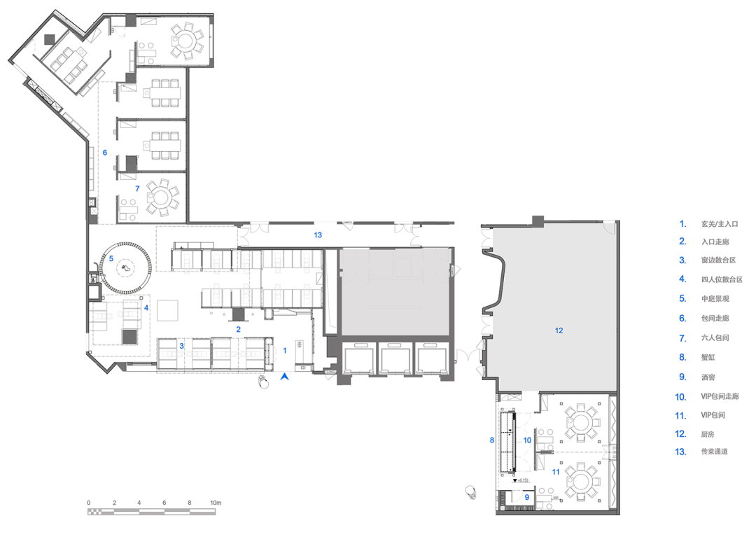 In the core dining area of the restaurant, in terms of spatial layout, the designer considered several interlaced internal and external spatial forms to integrate into it: there are deliberately lowered roofs without walls or incompletely enclosed pavilions; there are steps with varying heights of sight. There are also small-scale boat houses with row-by-side seats; or a porch half-enclosed under the sloping eaves. Various construction forms are adopted to enclose the core area of the restaurant into an inner courtyard-like public atrium.