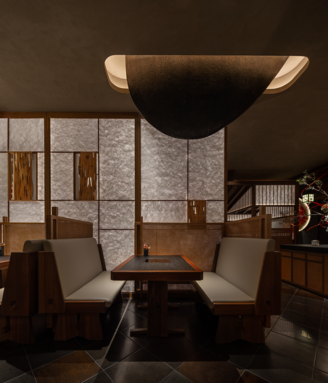 将东方传统建造的特有空间形式与当下的生活方式作结合,这种内、外、高、低的不同空间变化对人的情绪感知会产生影响,从而产生出一种新的或是多视角变化的就餐体验。在独立就餐区域,设计师强调了日式私密就餐体验的空间分隔性,将相邻座位就餐的互不打扰,含蓄与内敛地融入到每一个独立就餐区位之中。
