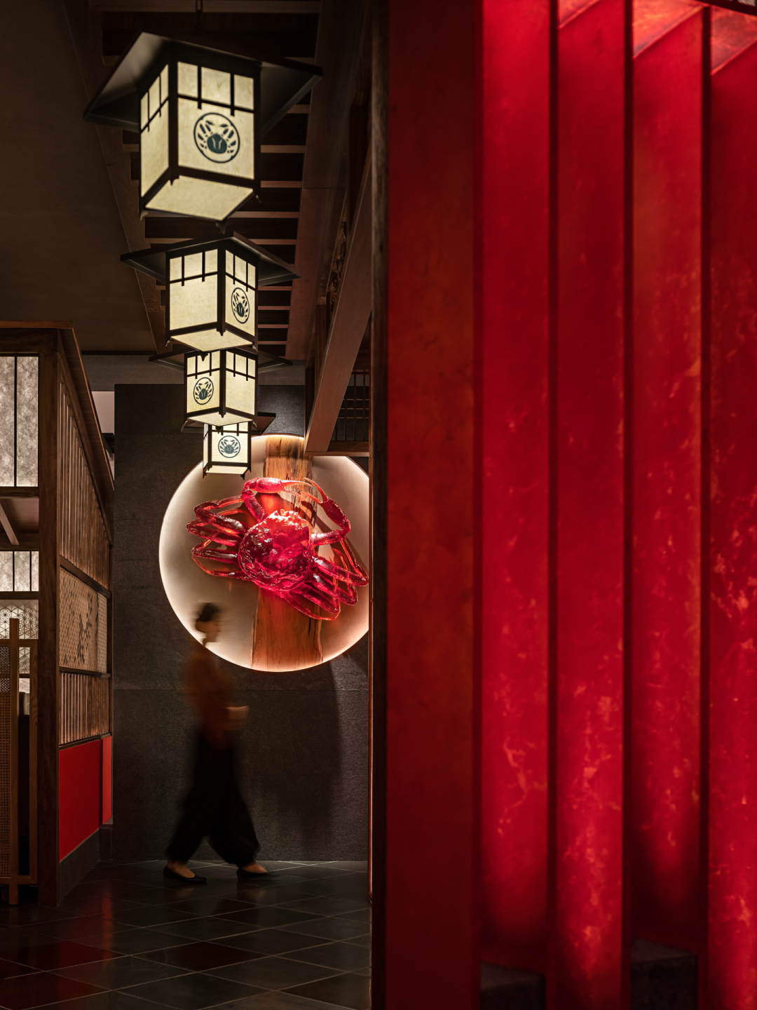 同蟹道品牌所追求的精致料理一致,在空间的细微之处将艺术品及日本匠人的手工艺融汇其中。在室内木造垂木椽架下,设计师将来自富士山下御殿场的木工世家胜间田茂之(Sikedaiku)亲手雕刻的楠木栏间镶嵌其中。施工中将每一块铜质瓦片用纯手工的方式安装于屋顶,工序虽繁更以心相照。