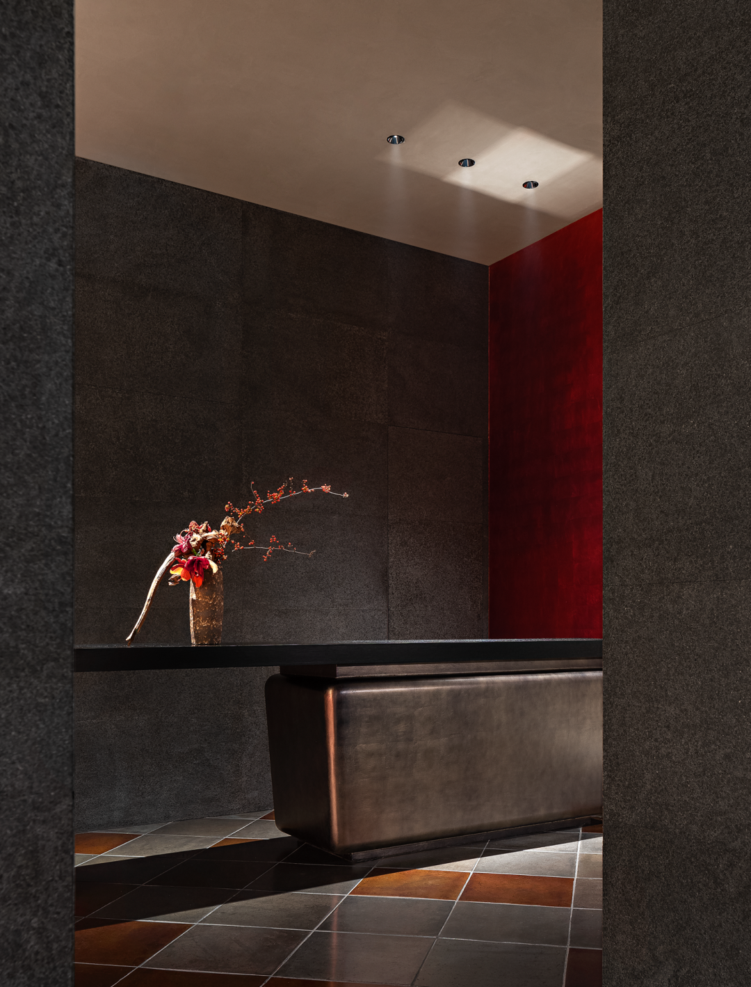 走入店内,通过缓慢的移动感受空间的变化。为了将城市中心区的繁忙与焦虑丢掉,体验安静与轻松的氛围。设计师在入口处设置回归质朴的空间——土玄关。迎面处的染色夯砼墙体,将情绪消解到平静。夯砼作为传统材料具有朴实、安稳的质地,在传统做法的基础上,融入现代建筑体块的结构感,相邻体块之间不规则的错落,留出了一片退让后的光源,与花艺相映成趣,并作为视觉平静的落点。