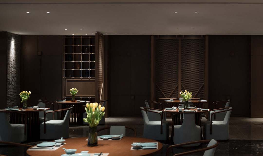 In the space conversion between the public dining area and the private room area, the designer uses an artistic installation to make an artistic conversion process between the private room area and the public space that are biased towards one corner.