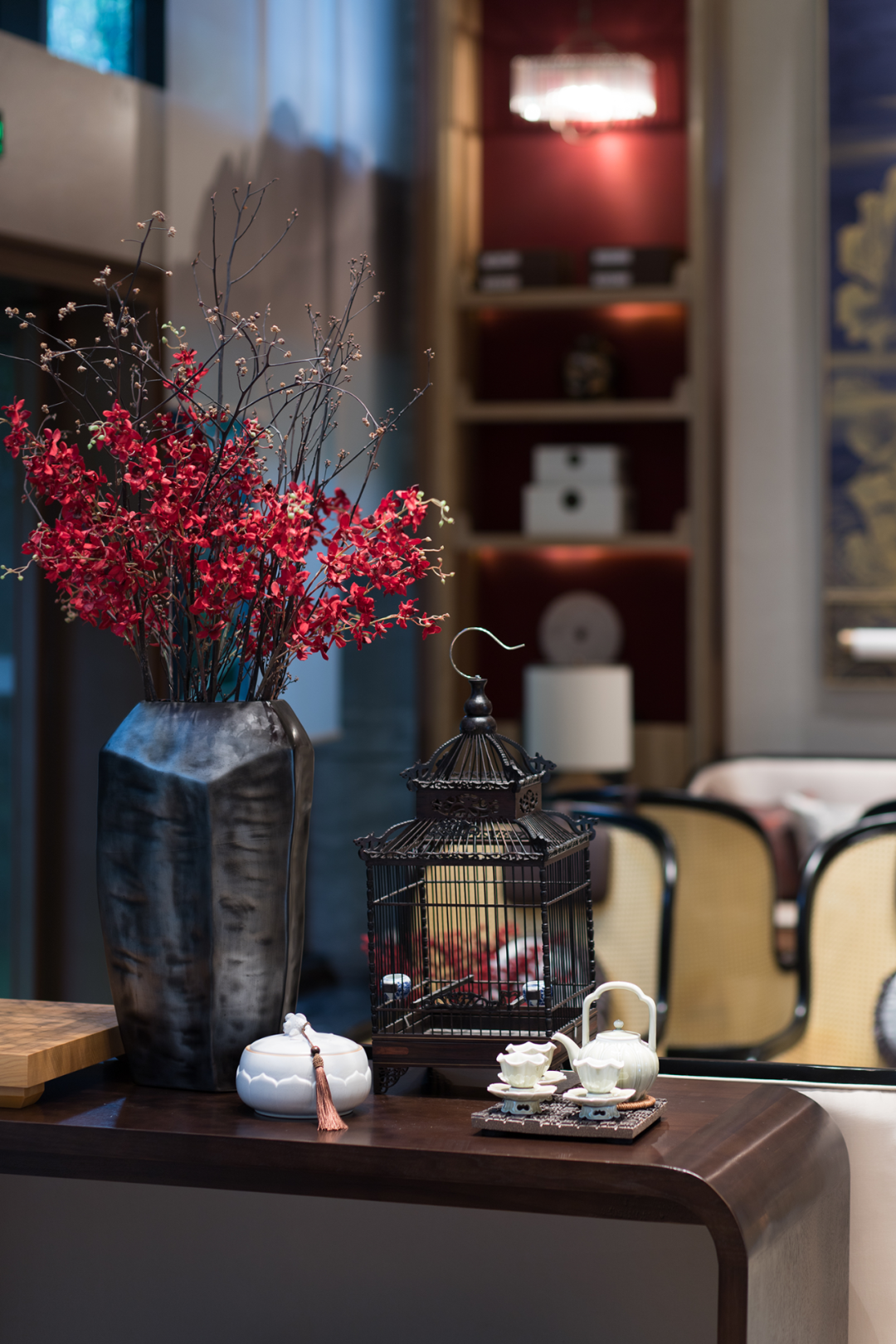在公共就餐区与私密包间区域的空间转换上,设计师通过置入艺术装置的方式,将偏于一隅的私密包间区与公共空间做了艺术性的转换处理。