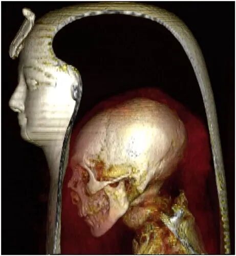 CT 扫描生成了木乃伊骨骼的二维和三维图像,推断法老于 35 岁前去世,眼睛深陷,有小而扁平的鼻子和窄下巴,身上缠着 30 个护身符,包括一条金色的串珠腰带。