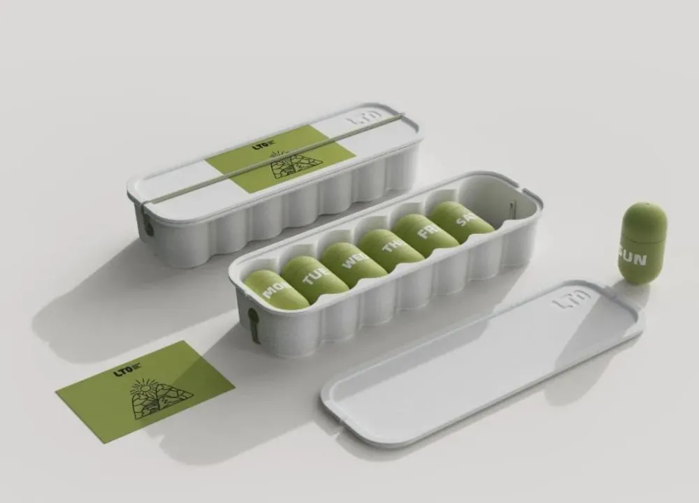 由胶囊+收纳盒组成,除了造型与传统礼盒大不相同,它的纸托原材料是纸浆纤维,100%环保。盒子侧面柱状结构,既保持美观独特,同时能有效固定产品。