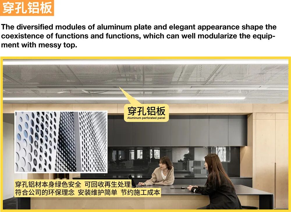 穿孔铝材本身绿色安全,兼具回收再生处理,环保节能等特点,符合本次业主公司的环保生产理念。安装维护简单,节约施工成本,铝板多样化的模块和优雅的外观塑造功能与功能共存,可以很好的把顶面凌乱的设备进行模块化处理。