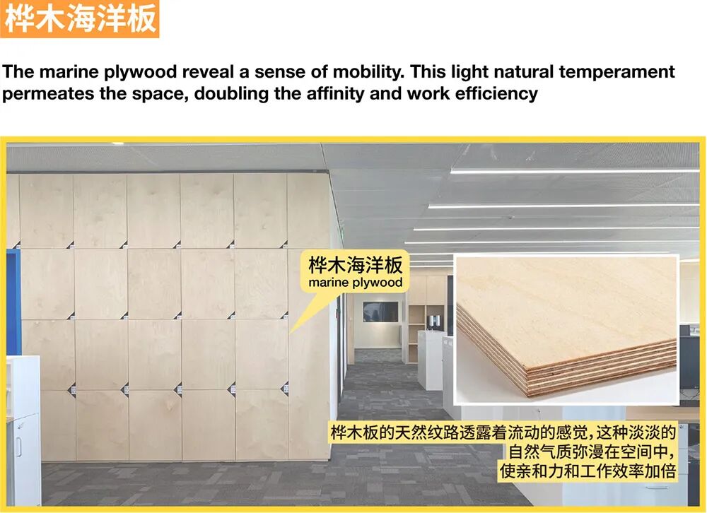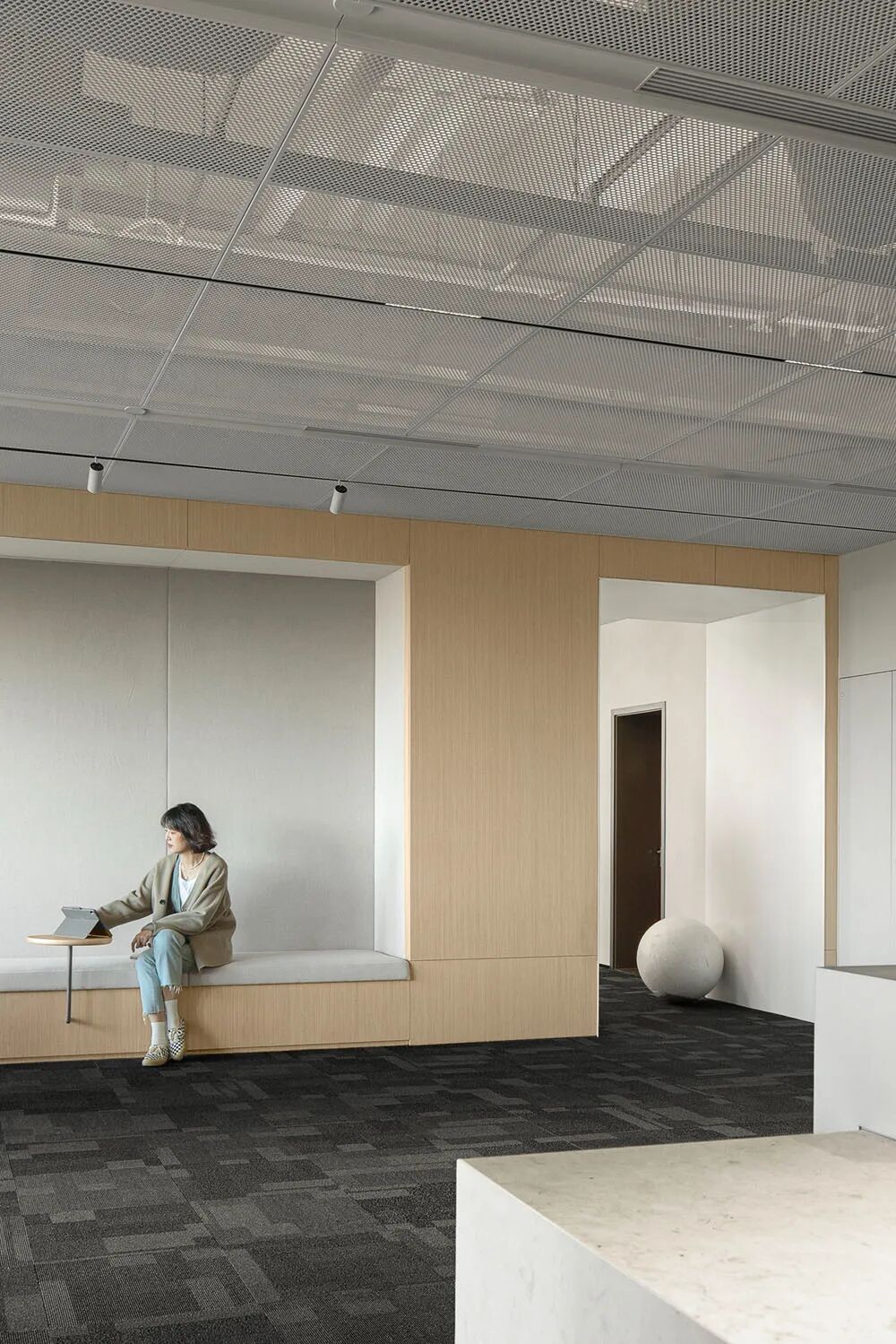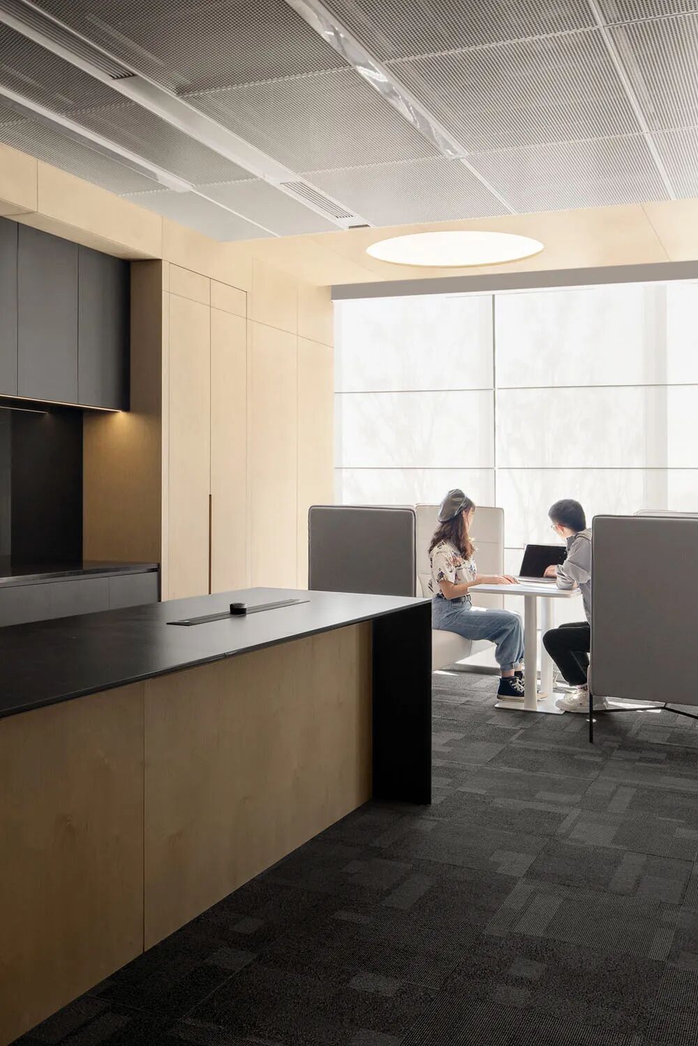 公共办公区采用大面积的中性色桦木板,营造出秩序、沉静、平衡之感,桦木板在开放办公区被广泛使用大面积使用,在墙板柜门上形成统一化的视觉语言,原始结构和顶面穿孔铝板、墙面的白色艺术涂料形成空间的留白。