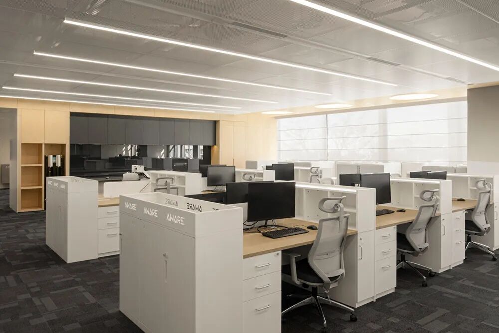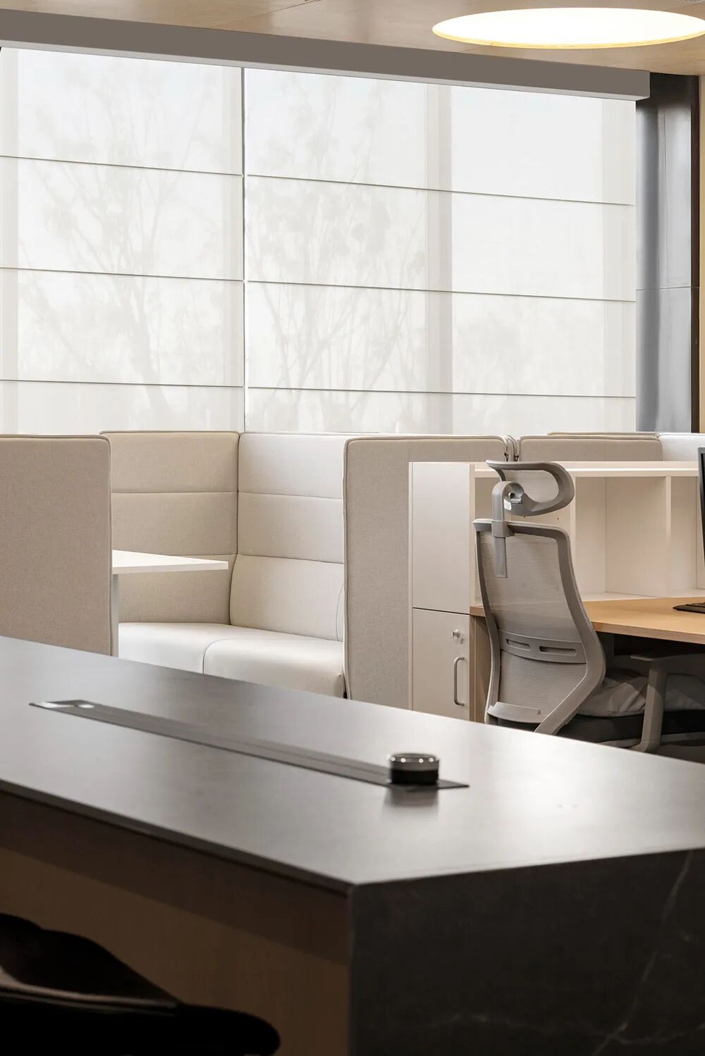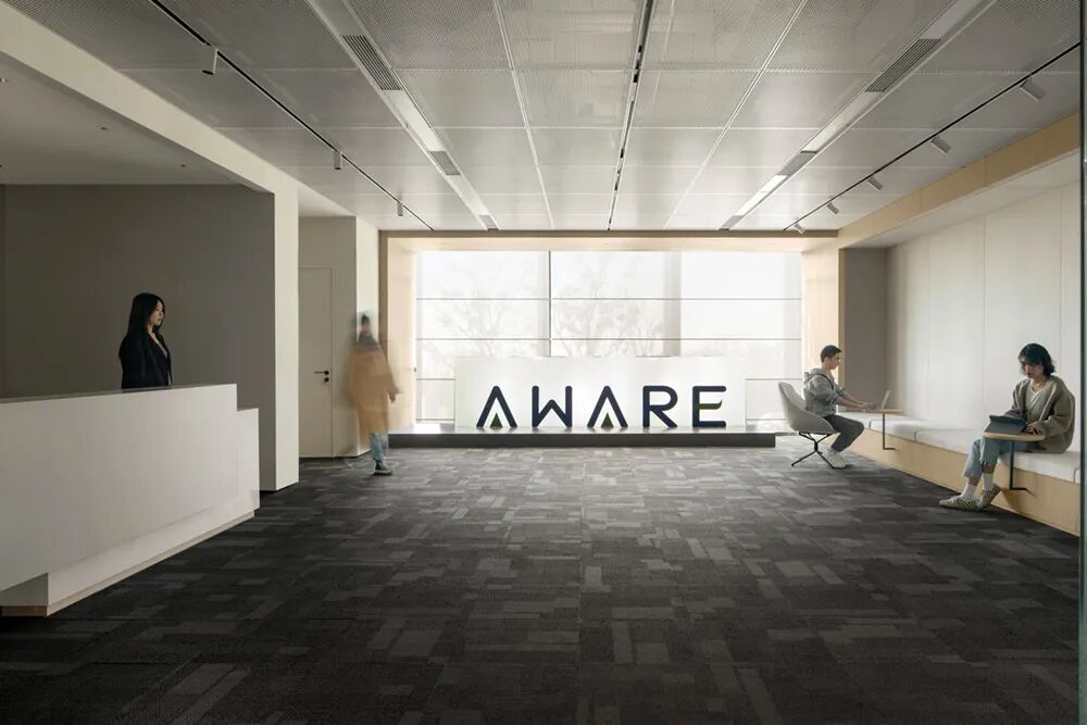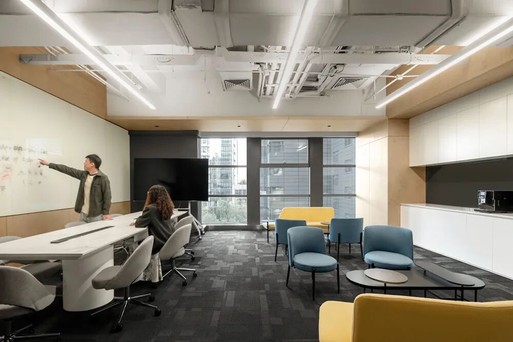 公共办公区采用大面积的中性色桦木板,营造出秩序、沉静、平衡之感,桦木板在开放办公区被广泛使用大面积使用,在墙板柜门上形成统一化的视觉语言,原始结构和顶面穿孔铝板、墙面的白色艺术涂料形成空间的留白。