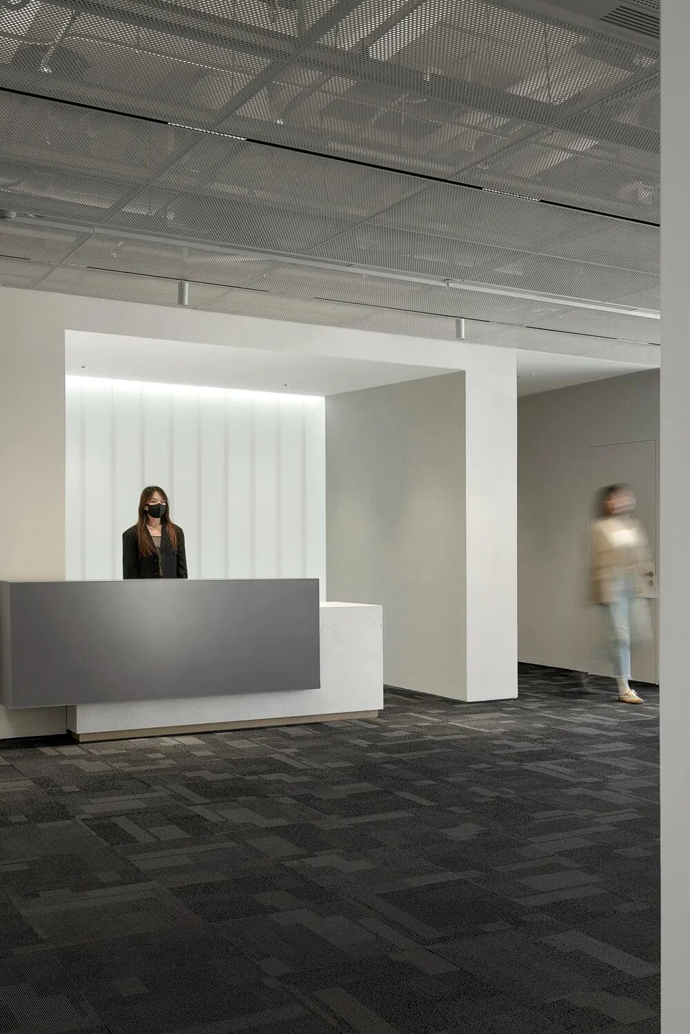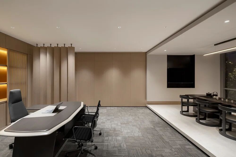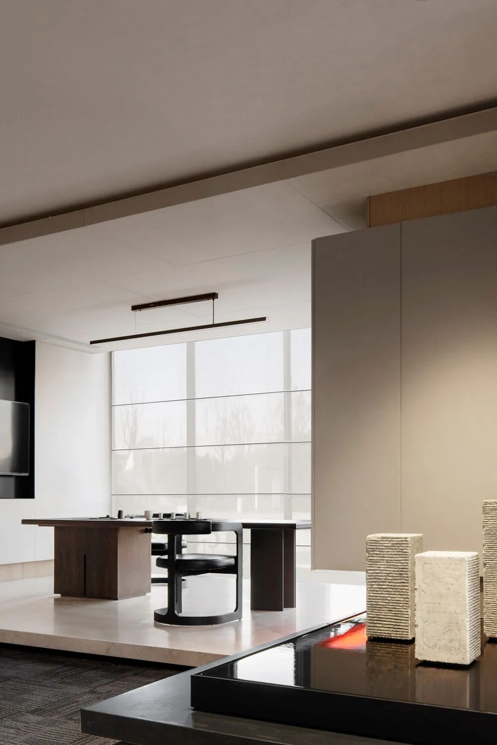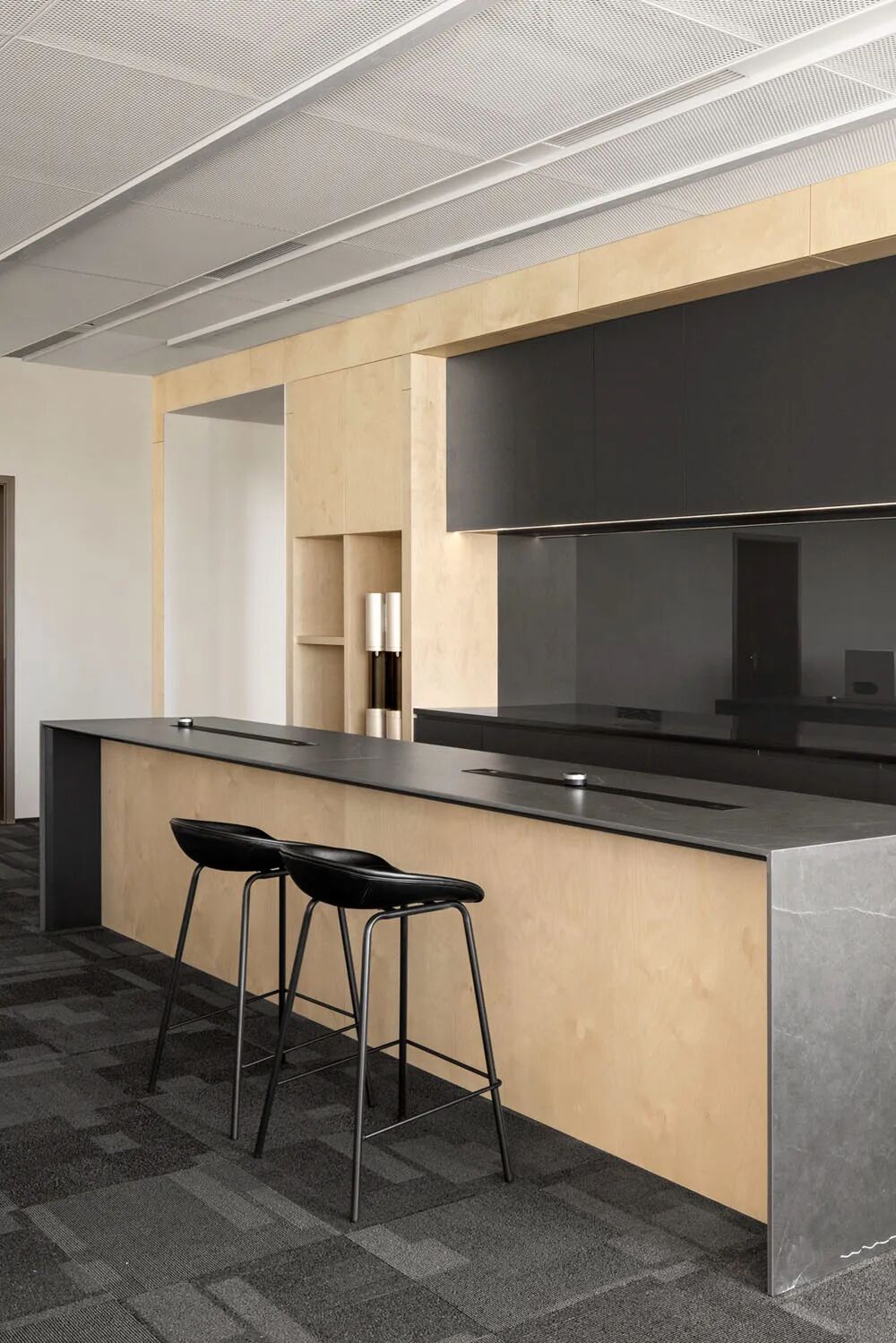 设计用不同的材质进行的体块的切割,让严肃的办公空间有了建筑的韵律。深与浅之间运用不同的材质丰富了画面的质感,形式与功能的平衡是设计师对这个空间赋予的核心。