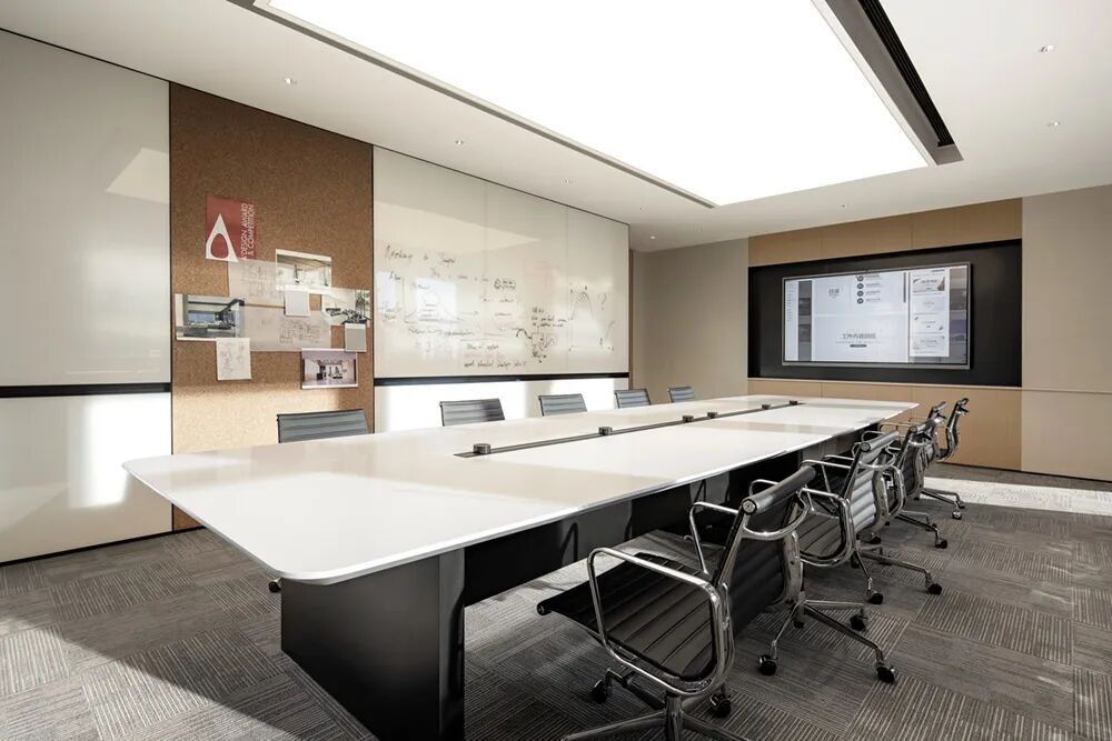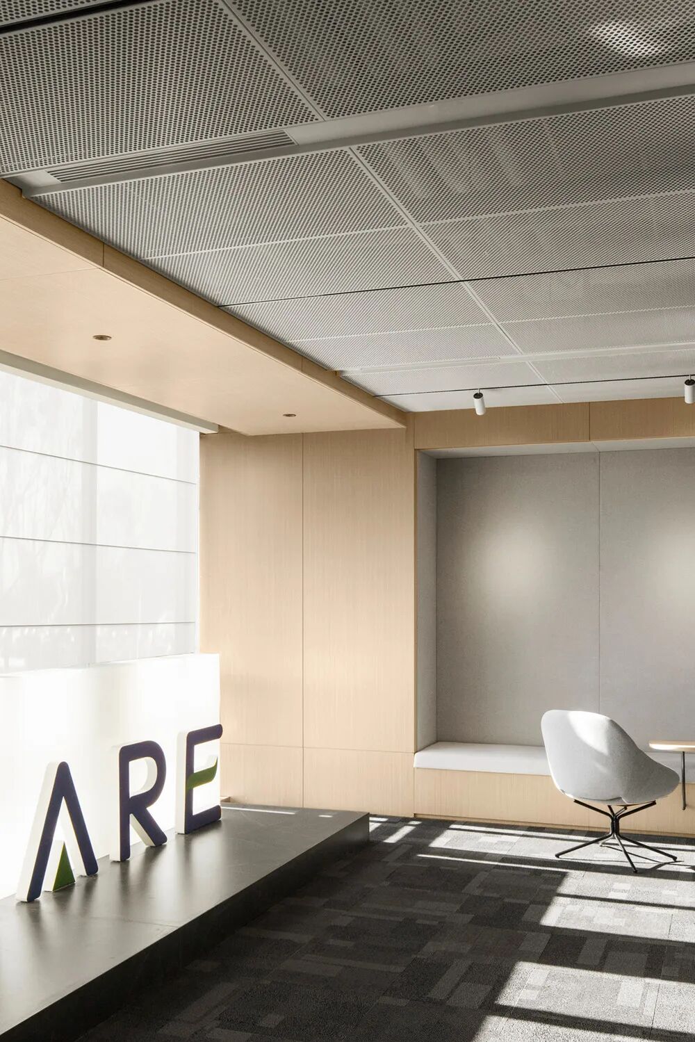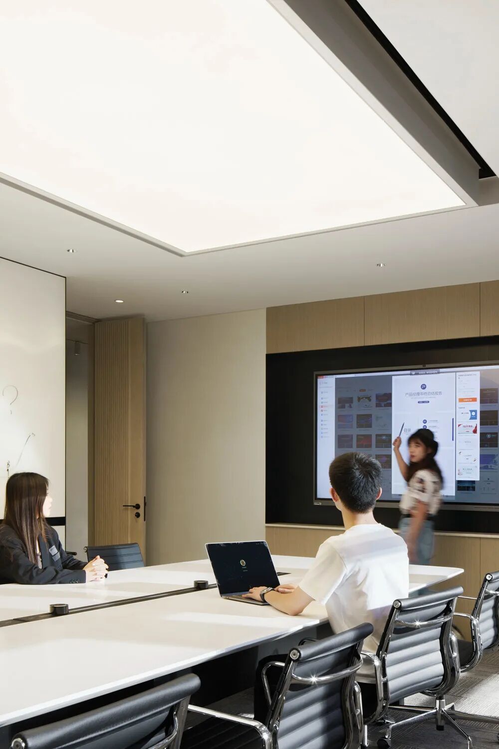 设计师将转角的墙面做成同样的材质,形成了空间的体块关系,材质与光影的交融,重构空间的气韵。顶面采用穿孔铝板贯彻了公司高效与环保的设计理念。