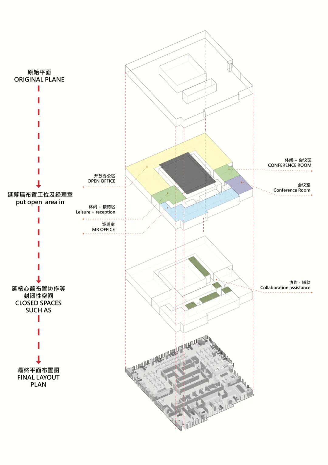 相较传统僵化办公室格子间,现代化工作是建立在即兴创作和协作的基础上,设计师充分尊重现有建筑结构和结构韵律,并考虑办公室所处的城市景观,放大的公共共享区域的面积,但又保持相互间的连贯性。