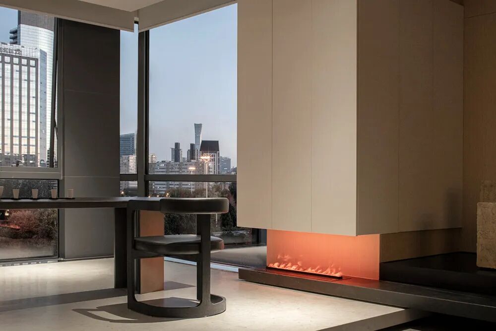 设计师选择了带有沉淀内敛的黑胡桃,独特质感不锈钢以及砚岩岩石板,茶桌桌腿进材质进行区分,满足基本使用的同时具有独特个性,桌面整体保持同一水平线的同时在黑胡桃木内嵌入砚岩岩石板,增加了桌面黑胡桃木内嵌收纳以及电磁水壶,乌金石茶盘一体化。备水、取茶,温器、投茶、醒茶、温杯、注水等泡茶流程都可以在桌面长上流畅操作完成。