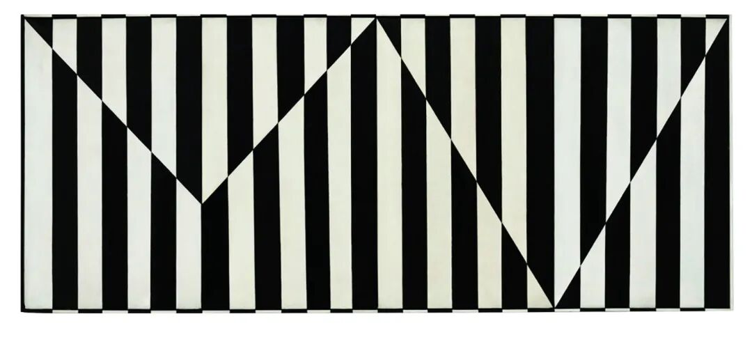在这幅鲜明的画作中,黑白线条穿过被锯齿线一分为二的画布,将框架分成两组三角形。这是一个赤裸裸的、甚至可以说是暴力的图像,其中精确的锐利边缘产生了一种反直觉的振动和运动感,埃雷拉似乎正在探索观众在画布上理解形状和颜色的过程,指出他们在构建自己脑海中的最终图像方面发挥了积极作用。