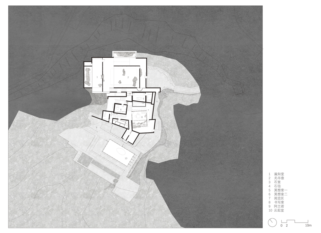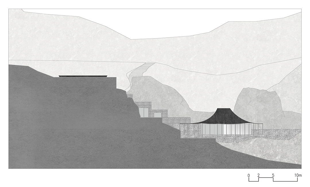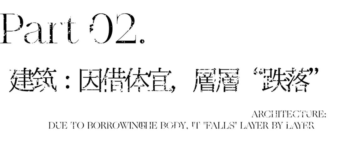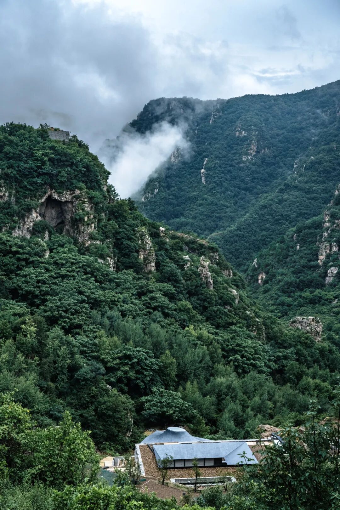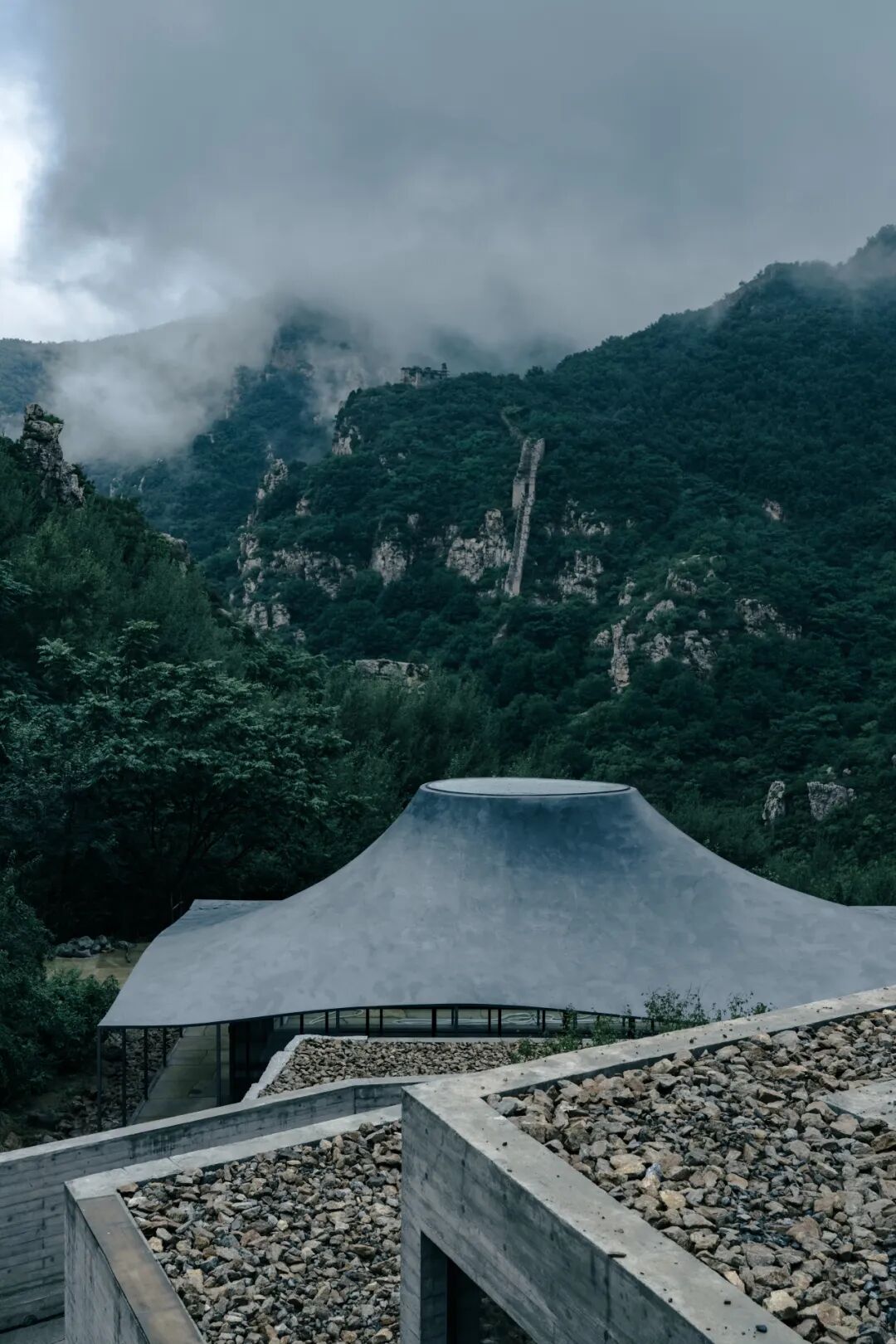 从最高处进入,通过建筑内部的楼梯拾级而下,一连串的空间形成巧妙的序列,散落于山间。