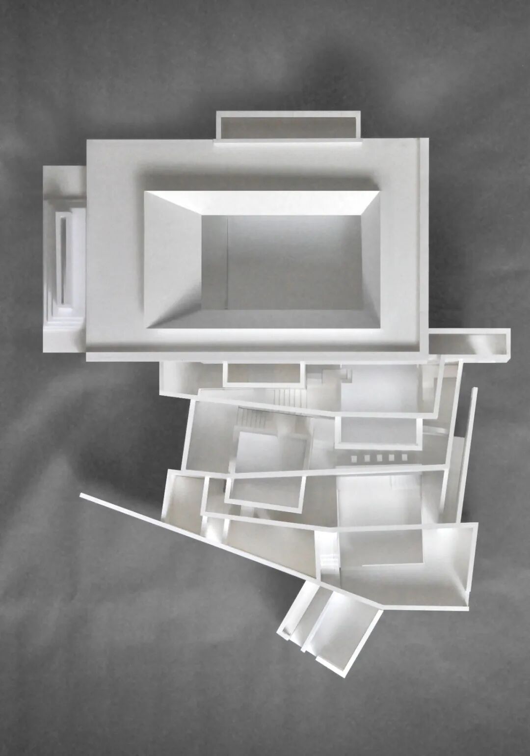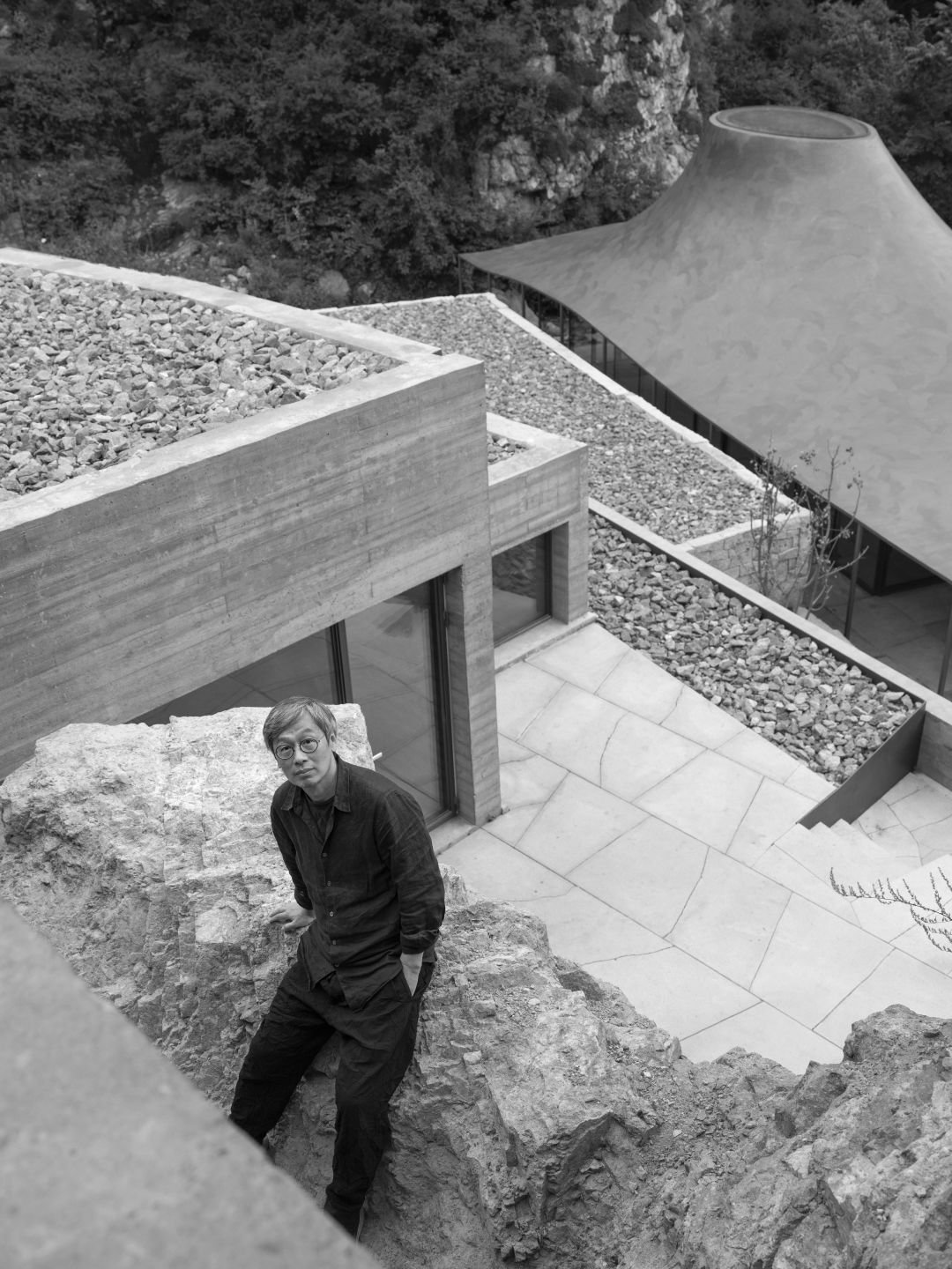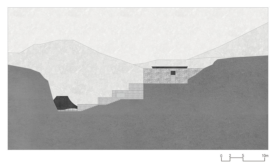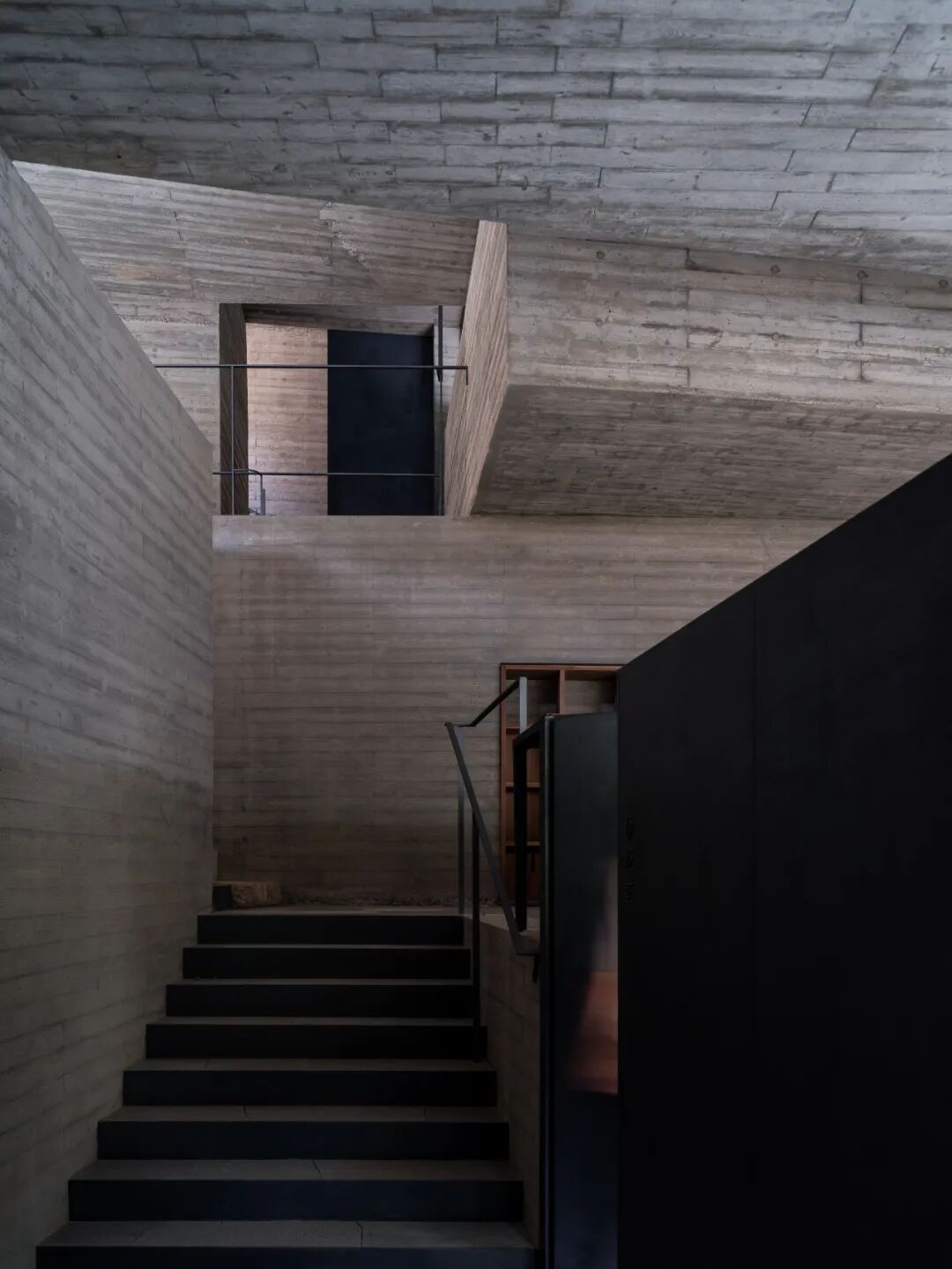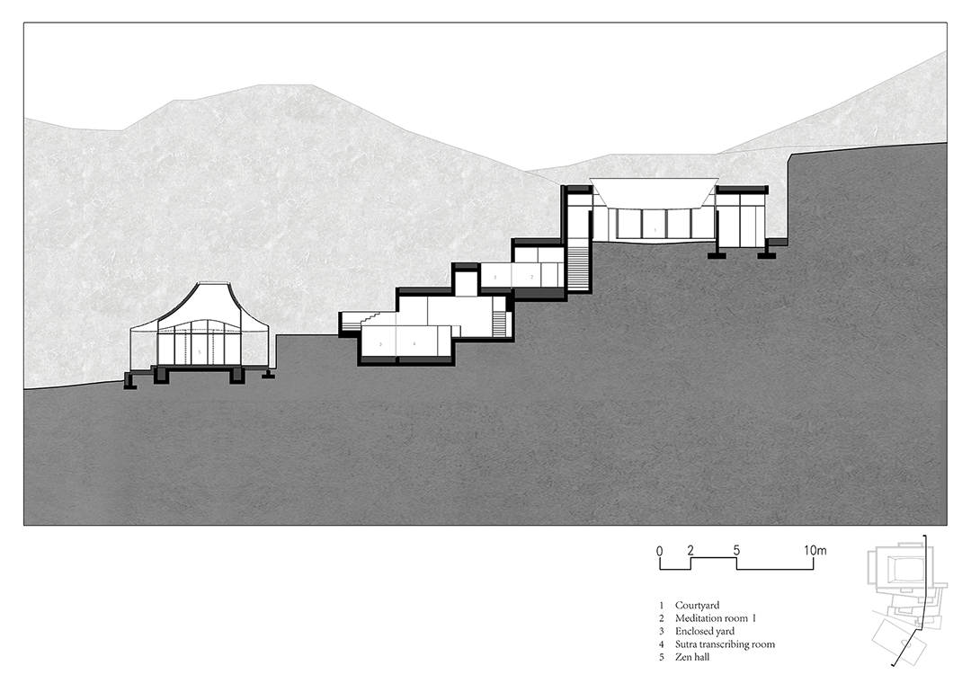 从最高处进入,通过建筑内部的楼梯拾级而下,一连串的空间形成巧妙的序列,散落于山间。
