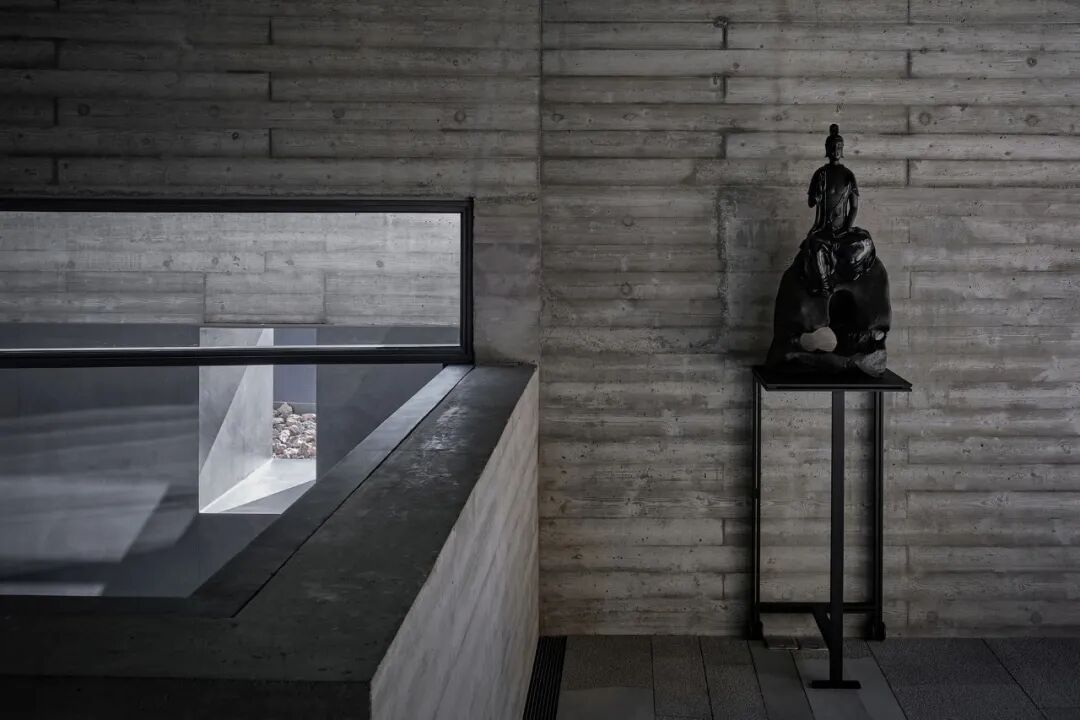 空院向上的开口刻画出了一个朝向天空的框景,从院内望去有远山、烽火台,有断崖峭壁和天际缓缓游弋的云彩,而朝向西侧山谷的水平开口,则正好框出古长城和一尊自然石像。佛堂名为“遍知堂”,取“以周遍了知之智慧”来断除烦恼之意。佛堂内有自然山石裸露于空间中。