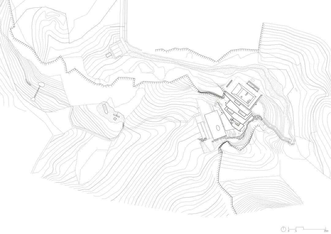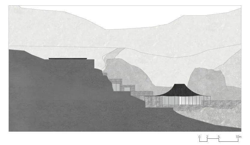 新的上院建筑除了下部台地上开敞的禅堂,上部建筑依山就势,将1.6米退级的台阶式景观地形转译为建筑的空间形式与尺度,它既是地形,也是建筑。