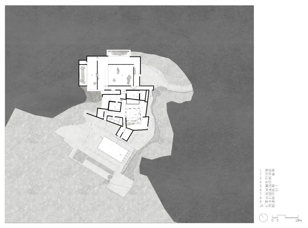 于是,石庭(无尽意)、佛堂(遍知堂)、冥想室、阅览室、书写室、禅堂(阿兰若),由上至下一连串的空间形成序列,附着于地形,内外开合,节奏井然。禅堂下苑山谷遍种果树百草,有曲折石径通往古长城。待下苑钟亭水井与原有煤矿遗迹景观整理完毕,金山岭上院乃成。