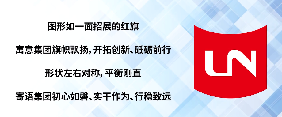 我们来看一下设计理念:时尚大气的LN字母在红色图形的衬托下展示,流畅的L与N无缝连接,首尾相连,象征集团大商贸、大旅游、大食品板块融合发展,以更强更优更大的实力,对标一流、挺进一流。