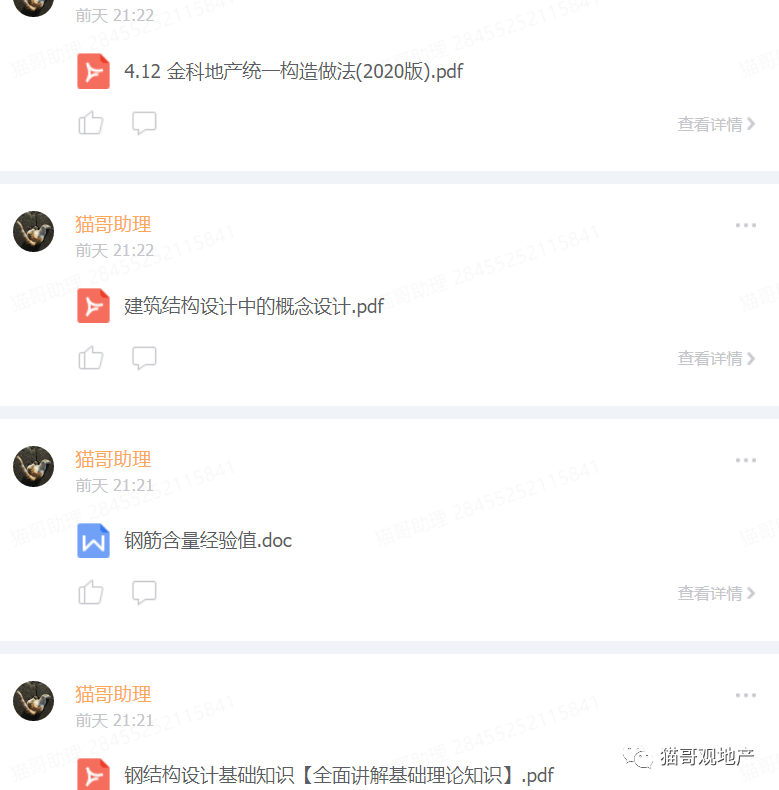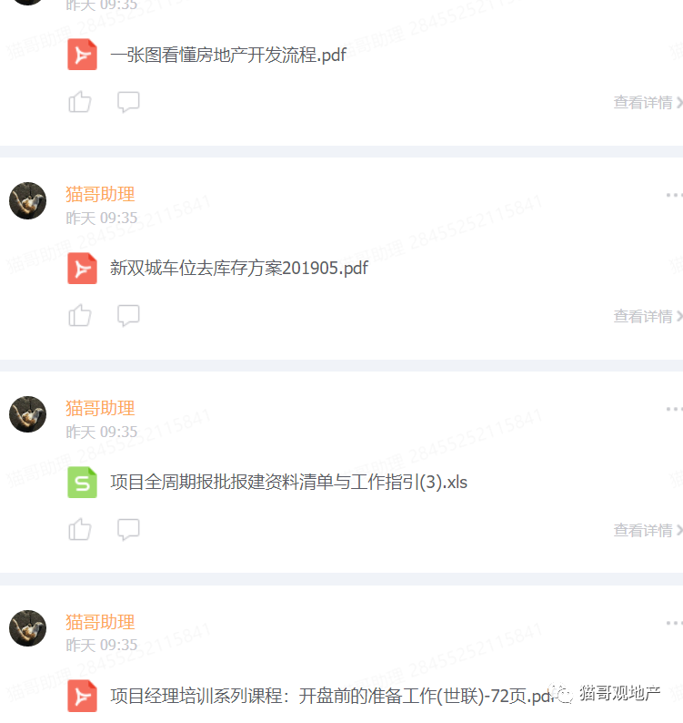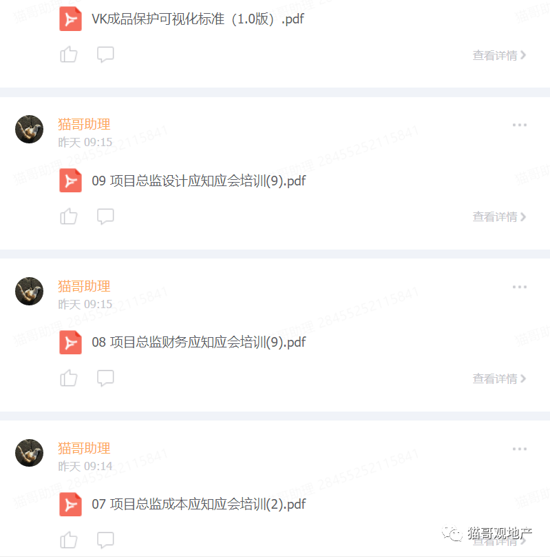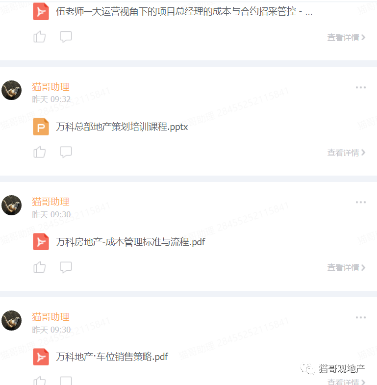而且,地产人是一个很爱学习的群体,经常有人在后台留言问我们有没有XX资料什么的,想多学习一下。因此,猫哥把日常遇到的所有资料,行业研报,以及跟多位地产大佬那里汇集的资料,整理汇总了一下,全部拿出来了。上传到了知识星球里面,供大家公开学习,随意下载。