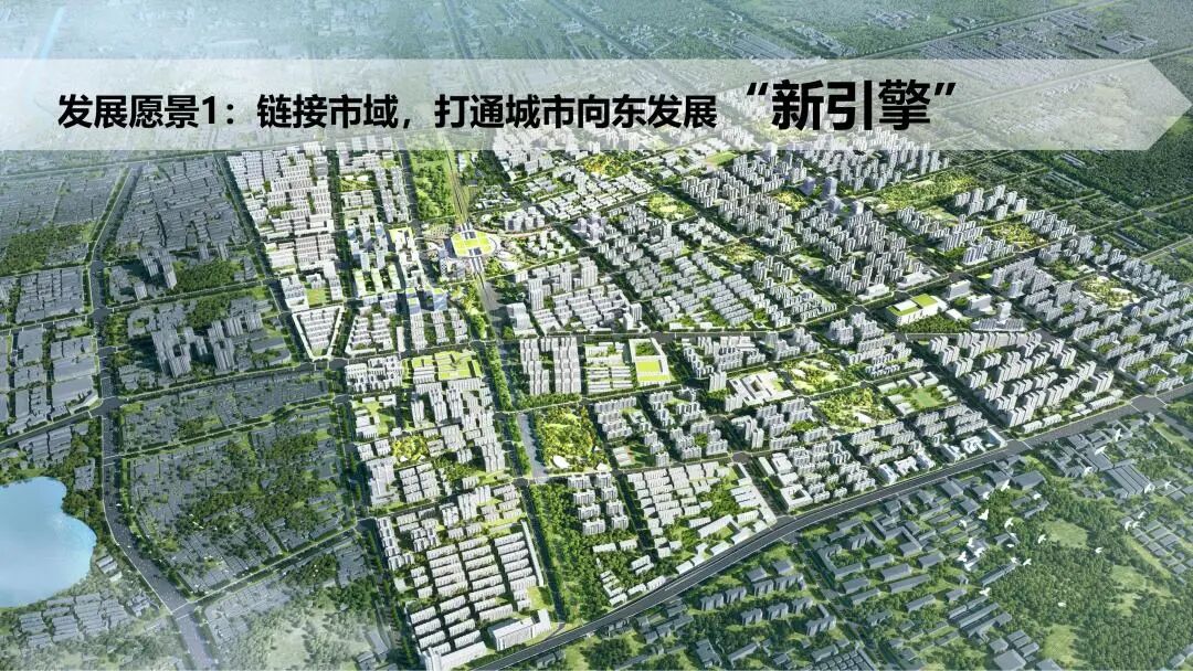 基于“从edge到bridge”的理念引领,围绕道路、绿地、铁路空间线索展开布局,形成“一轴、三心、一区、多片”的总体方案:
